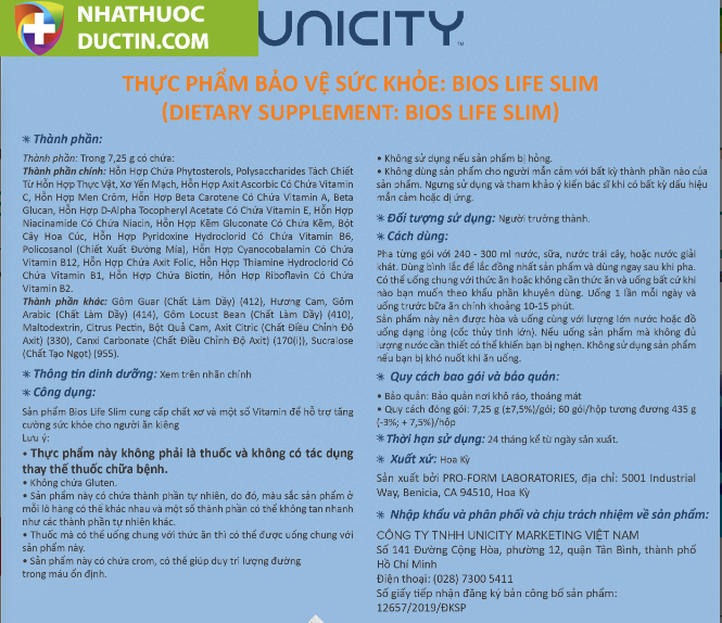 Thành phần của Bios Slim Unicity