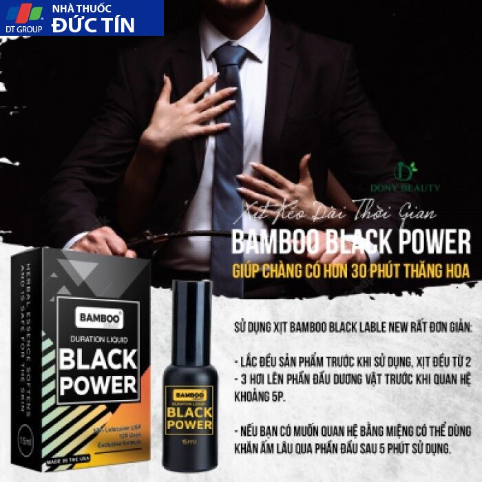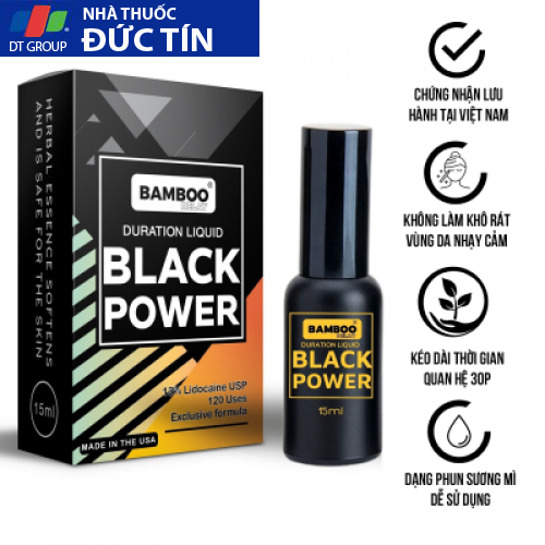 Chai xịt kéo thời gian cao cấp Bamboo delay Black Power 15ml là sản phẩm chống xuất tinh sớm được nhập khẩu từ Mỹ, có chứa Lidocaine USP 13% với cơ chế làm giảm tính nhạy cảm của dương vật hỗ trợ phái mạnh làm chủ cuộc yêu cực lâu, đã được chứng minh lâm sàng rất lành tính, không gây dị ứng, phản ứng phụ và hiệu quả nhanh, kéo dài thời gian giúp phái mạnh giữ vững phong độ.