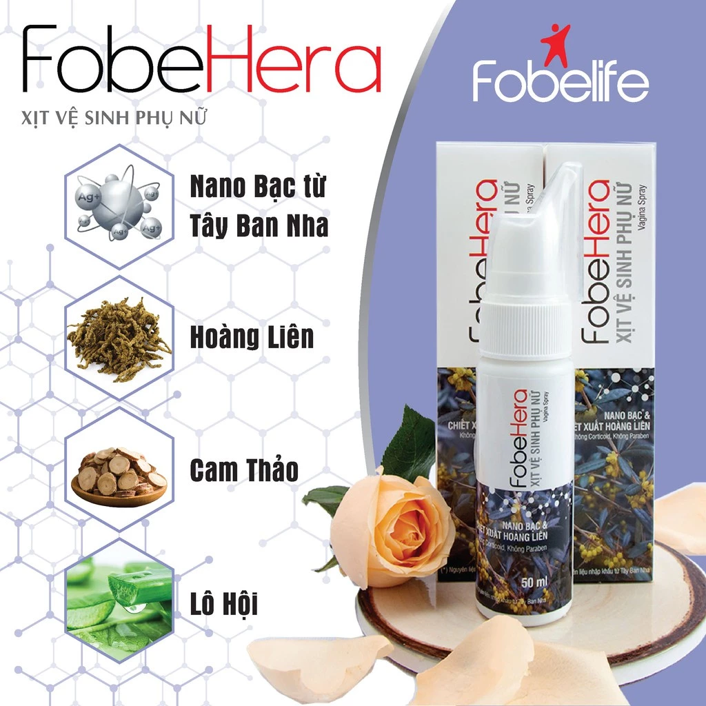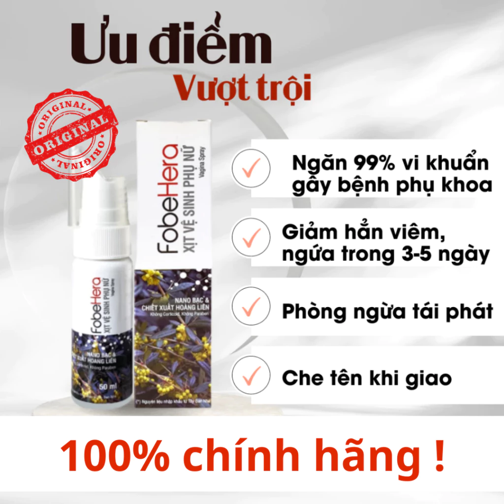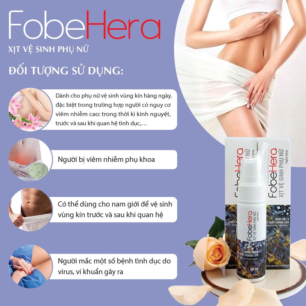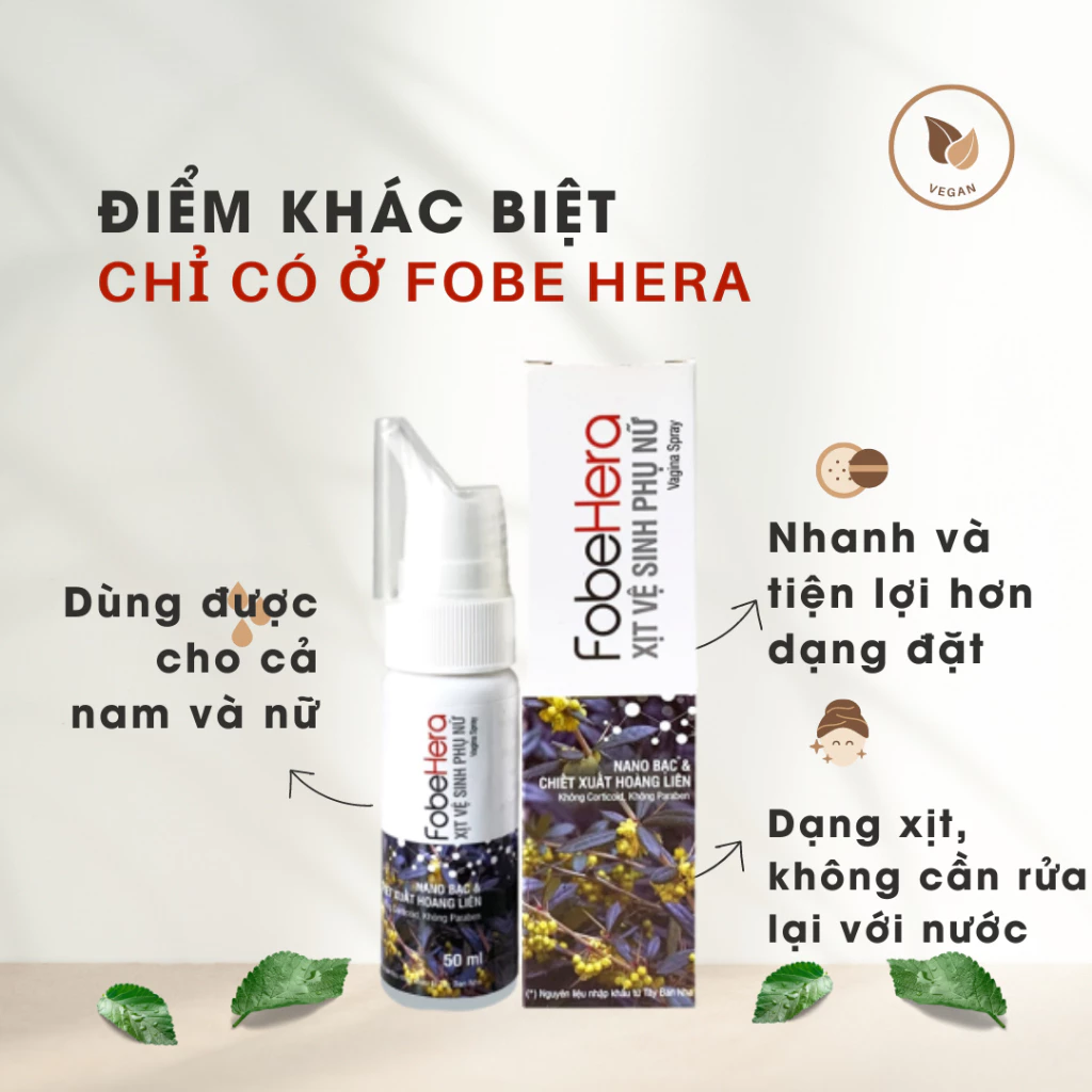 – Xịt phụ khoa Fobe Hera với thành phần chính gồm Nano Bạc 100ppm (nhập khẩu từ Tây Ban Nha), chiết xuất Hoàng Liên, cam thảo và lô hội ó khả năng ức chế nấm Candida – nguyên nhân hàng đầu gây viêm ngứa vùng kín nên khá thích hợp dùng trong các trường hợp: nhiễm nấm Candida, viêm nhẹ, khí hư vàng, ngứa và mùi hôi khó chịu…đặt biệt là bạn thấy dễ chịu ngay sau lần đầu tiên sử đụng sản phẩm.
