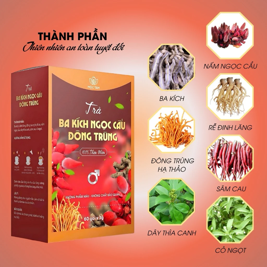 – Ba Kích, Ngọc Cẩu , Rễ Đinh Lăng, Đông Trùng Hạ Thảo, Dâm Dương Hoắc, Dây Thìa Canh, Sâm Cau, Cỏ ngọt
