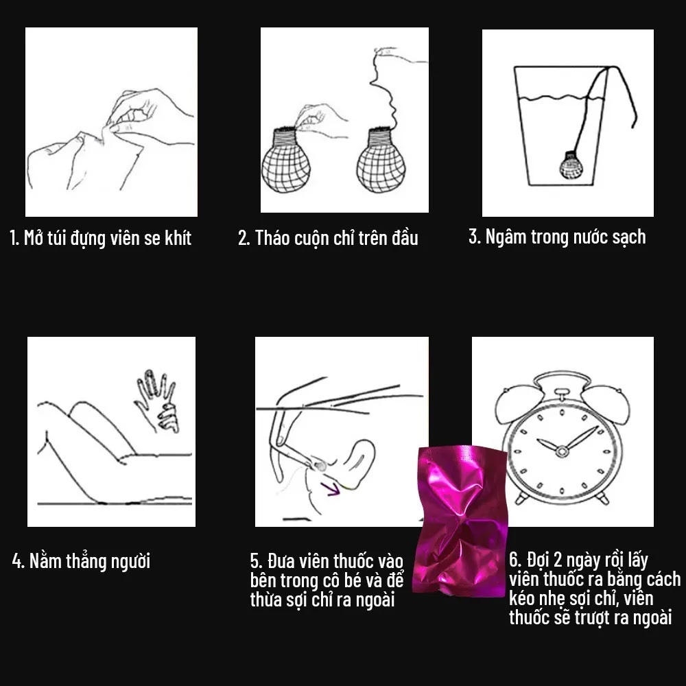 Mỗi lần sử dụng 1 Vi ên, mở túi đựng tháo cuộn chỉ trên đầu, để chỉ dài giúp lấy ra dễ dàng, ngâm nước sạch 5 phút rồi nằm thẳng người từ từ đưa sản phẩm vào trong (để sợi chỉ bên ngoài), đợi 2 ngày rồi lấy viên thu ốc ra bằng cách kéo nhẹ sợi chỉ viên thu ốc sẽ tự động trượt ra ngoài. Nghỉ 1 ngày rồi lặp lại tương tự tới khi nào như ý thì ngưng sử dụng.