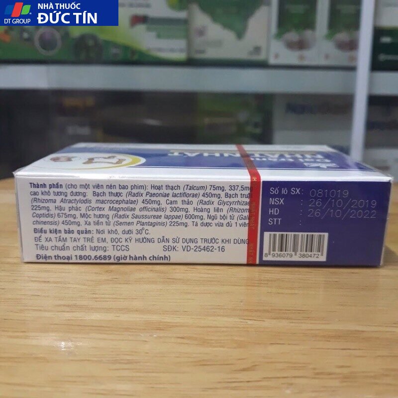 Hoàng liên 675mg, Hậu phác 300mg, Mộc hương 600g, Hoạt thạch 75mg, Bạch thược 450mg, Bạch truật 450mg, Cam thảo 225mg, Ngũ bội tử 450mg, Xa tiền tử 225mg