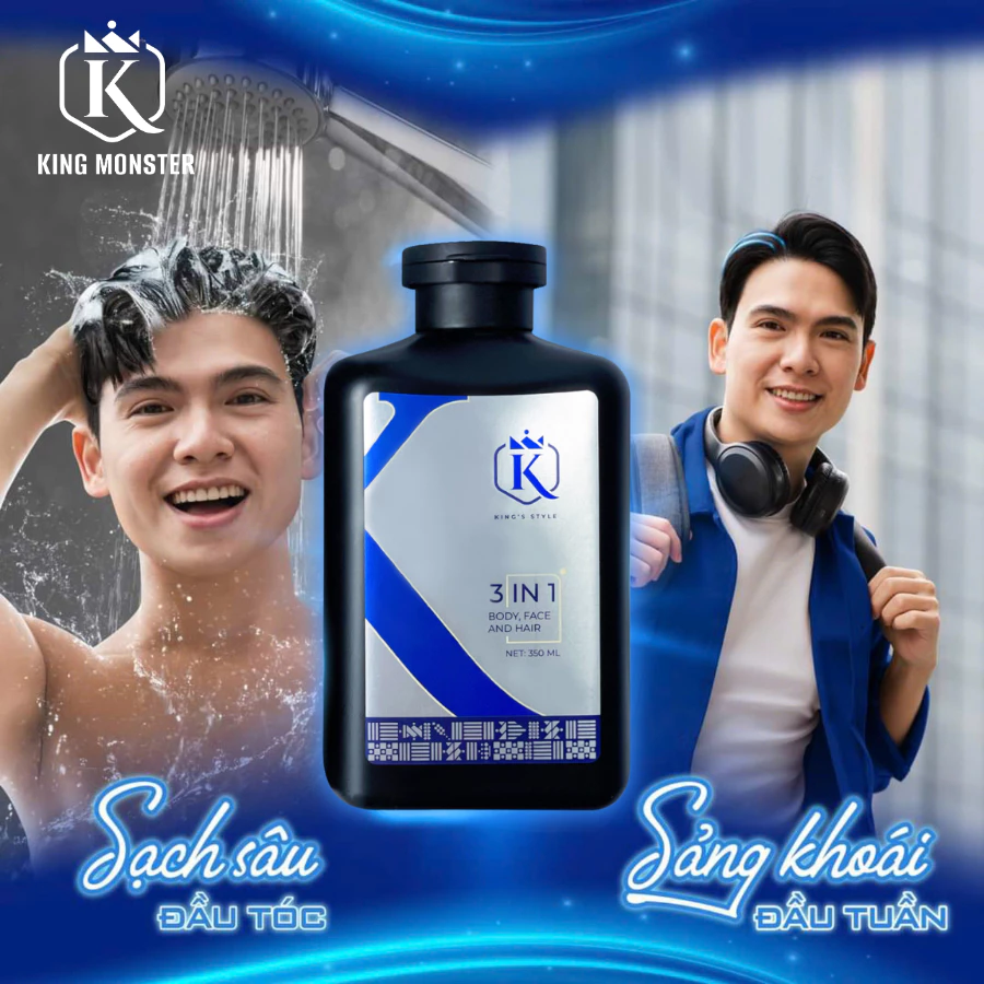 • Sữa tắm gội hương nước hoa 3 trong 1 KING MONSTER tiện dụng với công thức kết hợp sữa tắm, rửa mặt và dầu gội cho tóc chắc khỏe và cảm giác toàn thân sạch sảng khoái.