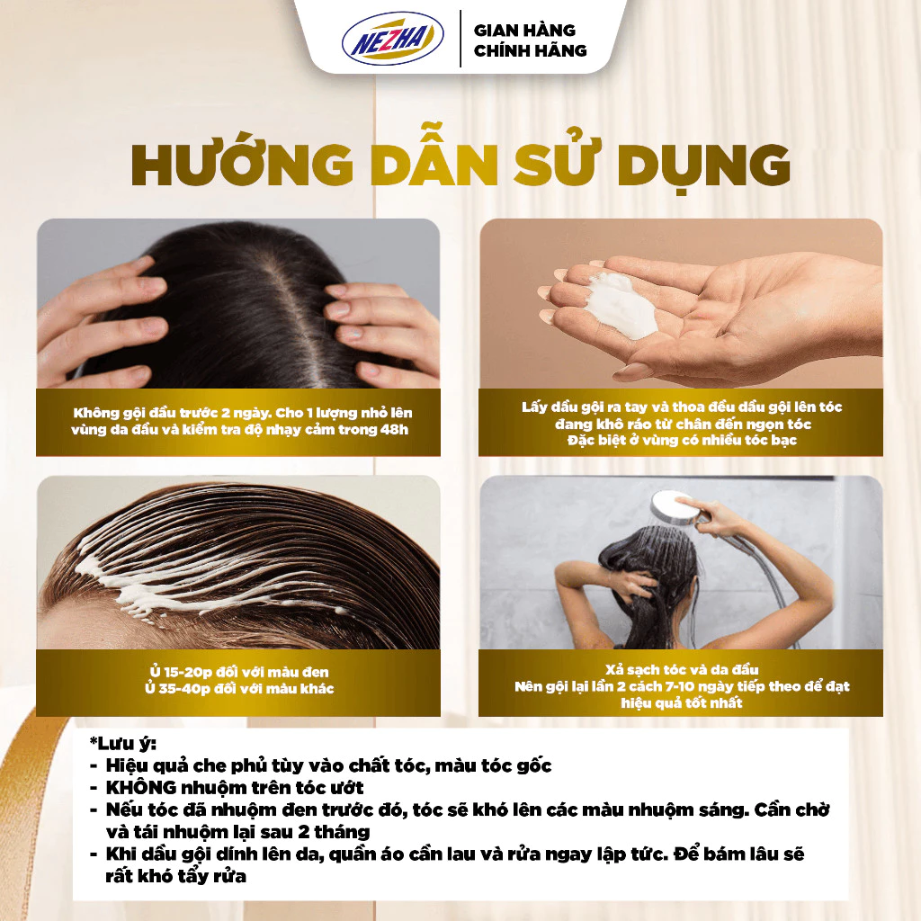 Lưu ý: Hiệu quả che phủ tùy vào chất tóc, màu tóc gốc và thời gian lưu sản phẩm. Sử dụng găng tay khi thao tác để tránh dây màu lên tay.