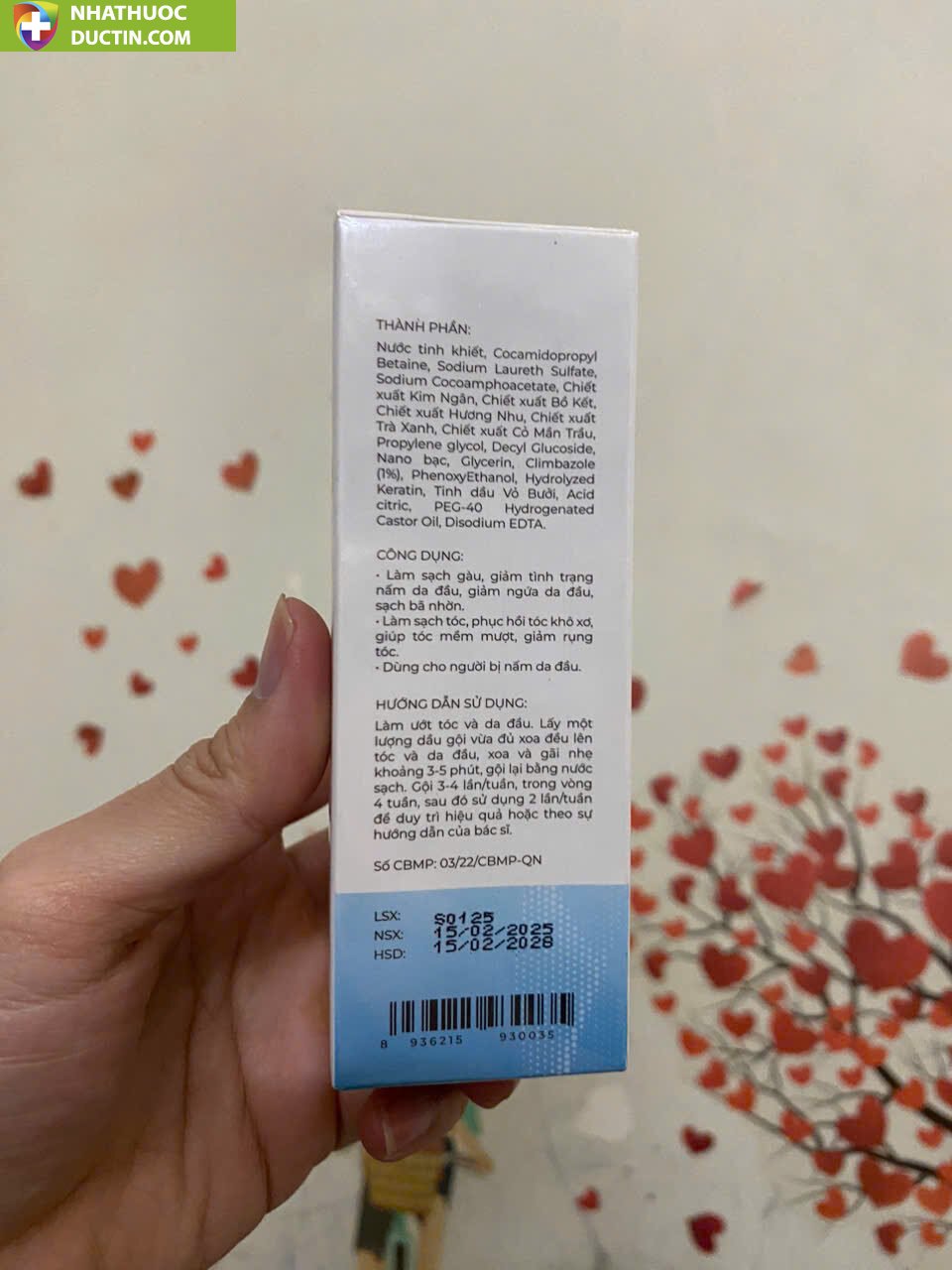 Climbazole (1%), Chiết xuất Kim Ngân, Nano bạc, Cocamidopropyl Betaine, Sodium Laureth Sulfate, Sodium Cocoamphoacetate, Chiết xuất Bồ Kết, Chiết xuất Hương Nhu, Chiết xuất Trà Xanh, Chiết xuất Cỏ Mần Trầu, Propylene glycol, Decyl Glucoside, Glycerin, PhenoxyEthanol, Hydrolyzed Keratin, Tinh dầu Vỏ bưởi, Acid citric, PEG-40 Hydrogenated Castor Oil, Disodium EDTA, Nước tinh khiết.