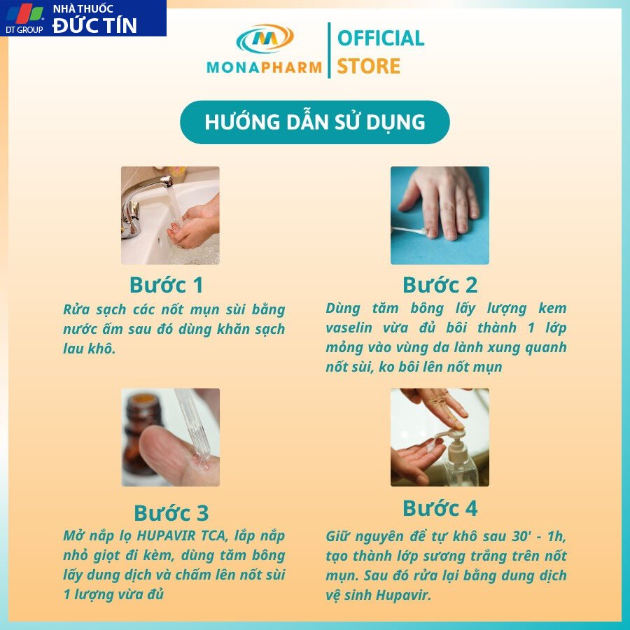 – Sau khi chấm Hupavir TCA 1 giờ thì rửa bằng nước sạch rồi bôi Hupavir Ointment, bôi Hupavir Ointment cả vào sùi và xung quanh