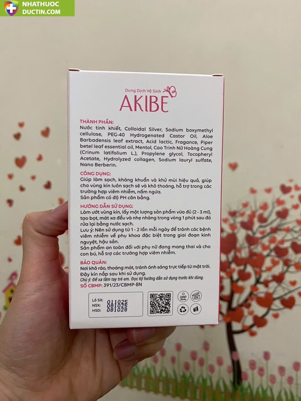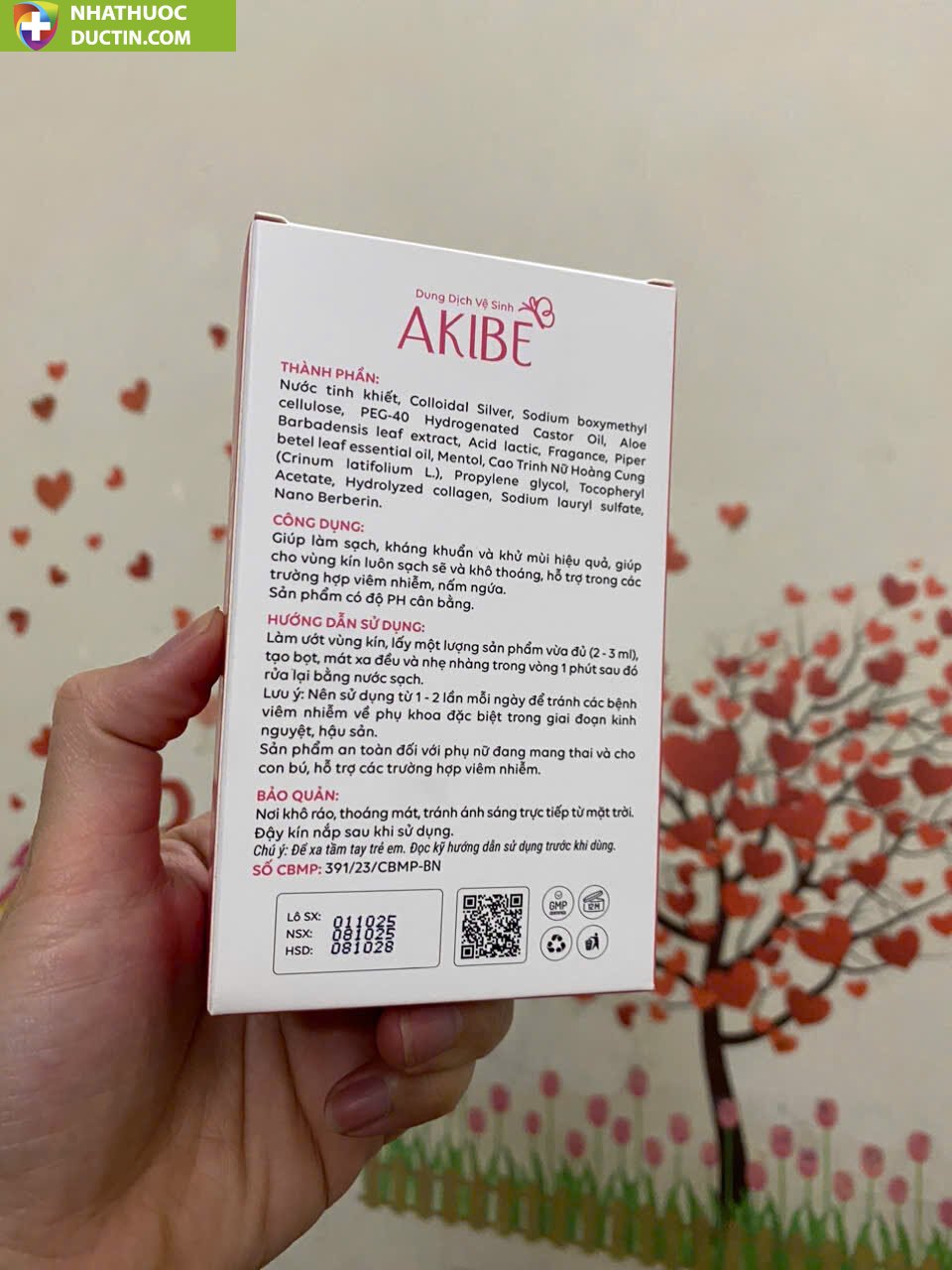 Sản phẩm dung dịch vệ sinh phụ nữ Akibe là một trong những sản phẩm chăm sóc sức khỏe phụ nữ được sử dụng rộng rãi hiện nay. Với ứng dụng công nghệ Nano Collagen, Nano Bạc cùng các loại dược liệu thiên nhiên như trinh nữ hoàng cung, lá trầu không và lô hội, sản phẩm giúp chống viêm, kháng khuẩn, làm nhuận hồng, ngăn ngừa mùi hiệu quả.