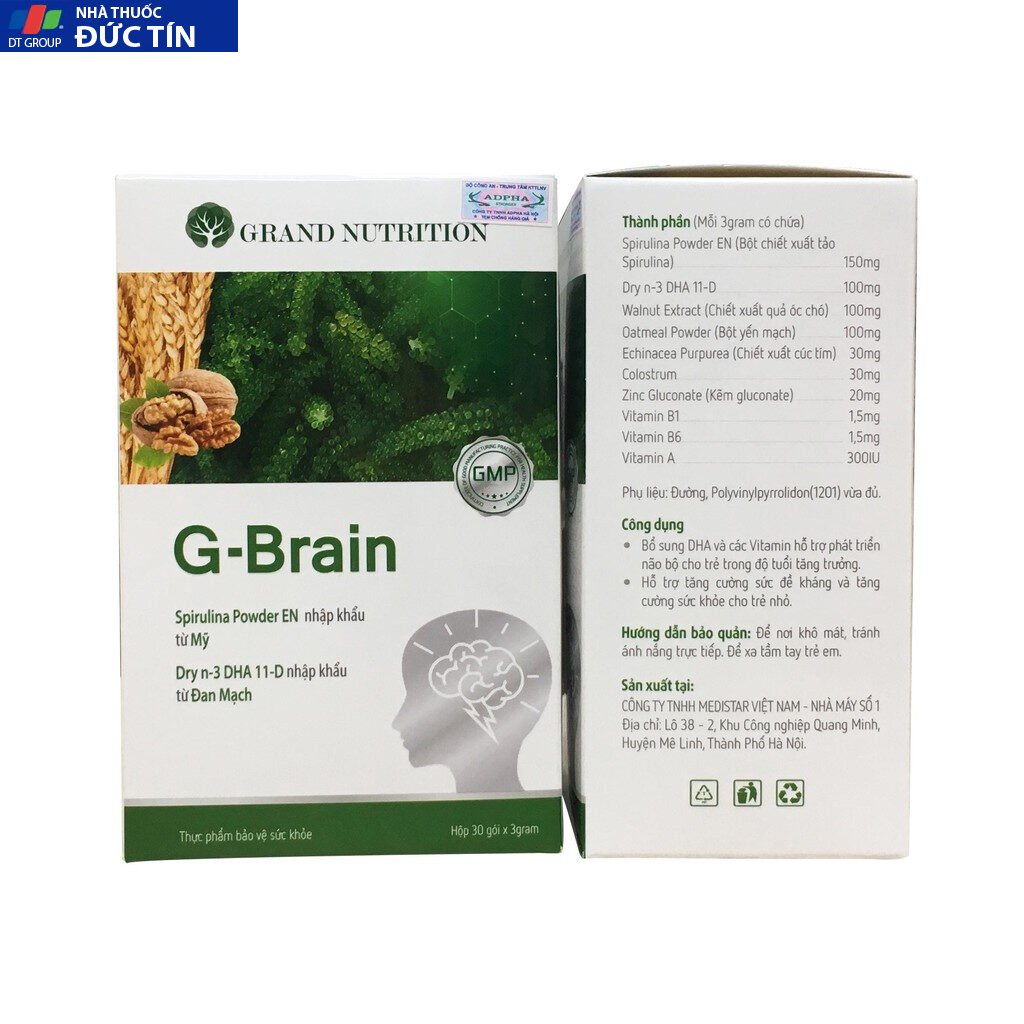 Công dụng Cốm sữa tảo non G-Brain : giúp trẻ có một bộ não khỏe mạnh, gia tăng sự thông minh, nhạy bén, sáng tạo và phát triển trí não một cách toàn diện. Sản phẩm giúp trẻ Phát Triển Trí Não hiệu quả vì G-Brain được kết hợp từ những thành phần chất lượng nhập khẩu 100% từ phương Tây như Tảo Spirulina, Sữa bò non Colustrum từ Mỹ; DHA từ Đan Mạch và những thành phần quý tại Việt Nam như Quả óc chó, Yến Mạch,…