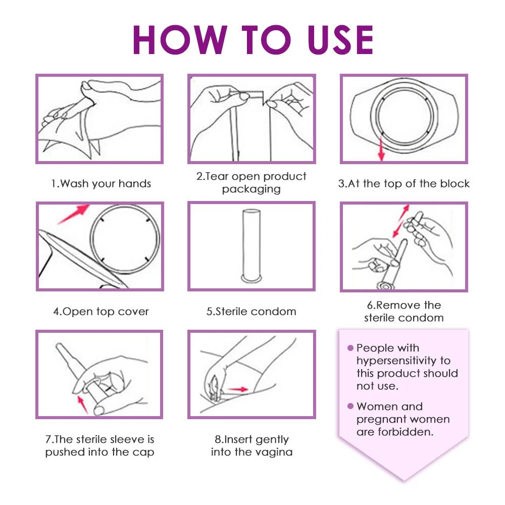 Cách sử dụng: Sử dụng gel trước khi đi ngủ. Mở nắp bảo vệ vòi phun, tháo nắp, nằm trên giường. Đưa sản phẩm từ từ khoảng 6cm-7cm vào vùng kín, mở nắp sau vòi, đẩy gel ra từ từ, nằm trên giường 1 – 2 tiếng, tránh để chất lỏng chảy ra ngoài cơ thể. Sử dụng một lần mỗi ngày.