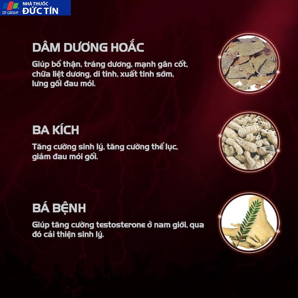 – Ba kích: các nghiên cứu dược lý cho thấy Ba kích giúp tăng sức dẻo dai, tăng sức đề kháng, hỗ trợ trong trường hợp sinh lý yếu, tăng cường thể lực, giảm đau mỏi khớp.