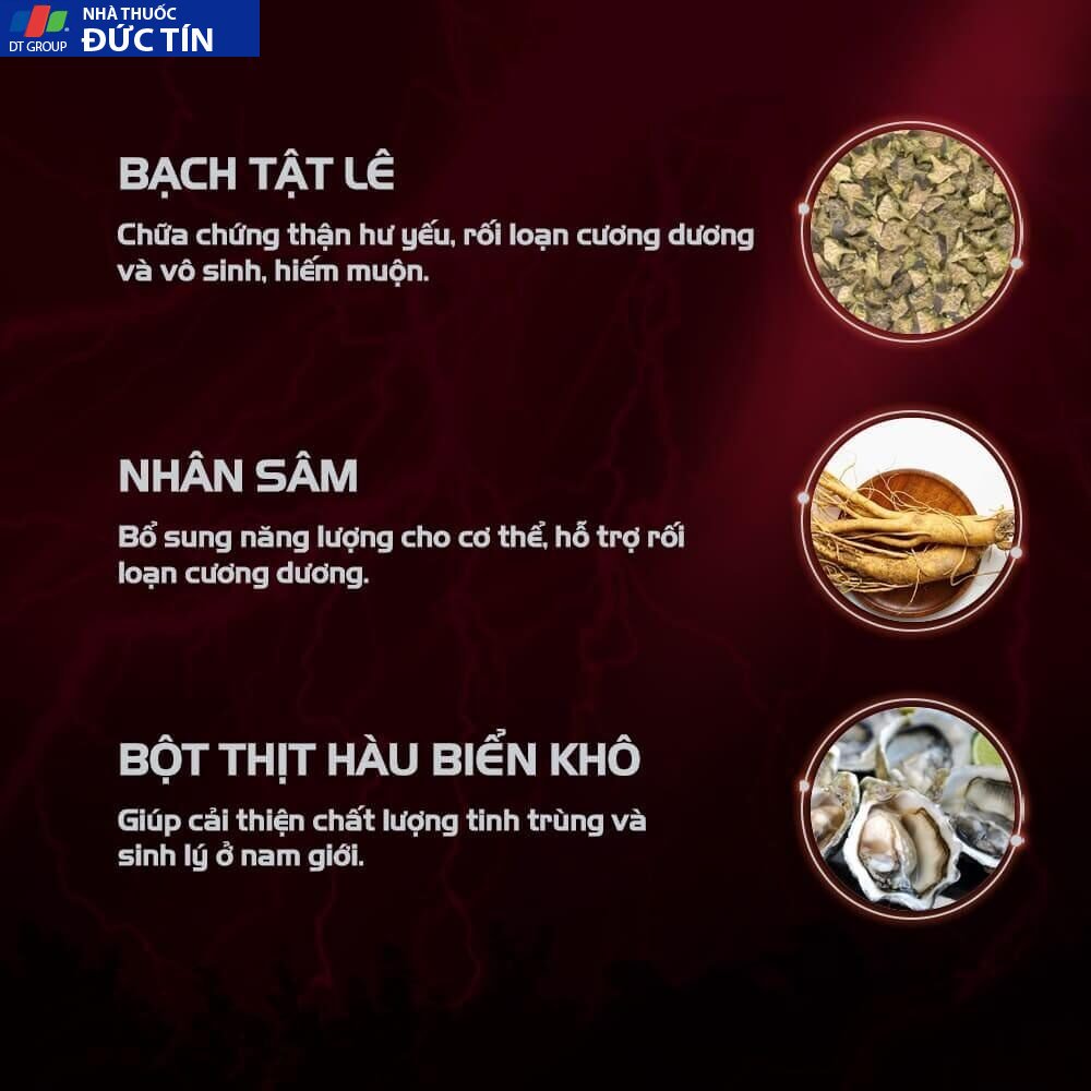 Hỗ trợ bổ thận, tráng dương, giúp tăng cường sinh lực và tăng khả năng sinh lý ở nam giới. Hỗ trợ hạn chế quá trình mãn dục sớm.