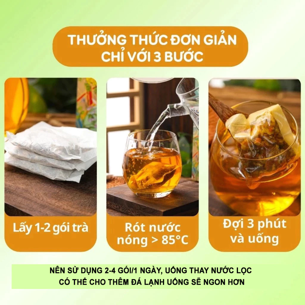 – Cho 1 -2 túi trà vào cốc, rót 200ml nước sôi 80-100 độc C ngâm từ 2 đến 5 phút và thưởng thức. Uống hết châm thêm nước uống lần 2, lần 3 vẫn rất ngon.