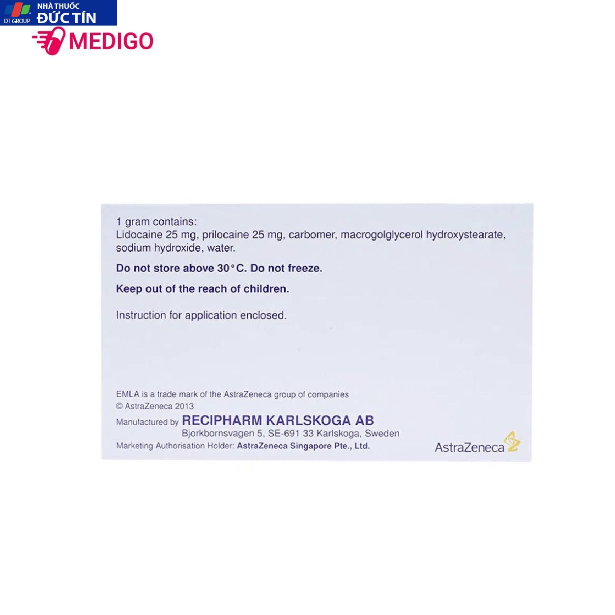 Thuốc Emla 5% được sản xuất bởi Công ty Recipharm Karlskoga Ab (Sweden). Sản phẩm được bào chế dạng kem bôi, 1 hộp thuốc gồm 5 tuýp có trọng lượng 5g. Thuốc chỉ sử dụng khi có chỉ dẫn của bác sĩ.
