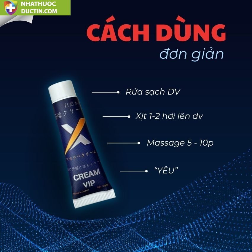 Sử dụng rất dễ: Lấy một lượng nhỏ kem, thoa đều lên vùng kín (tránh bao quy đầu nếu nhạy cảm), massage nhẹ và chờ 10-15 phút trước khi quan hệ. Lau sạch bằng nước nếu cần sau khi đạt hiệu quả.