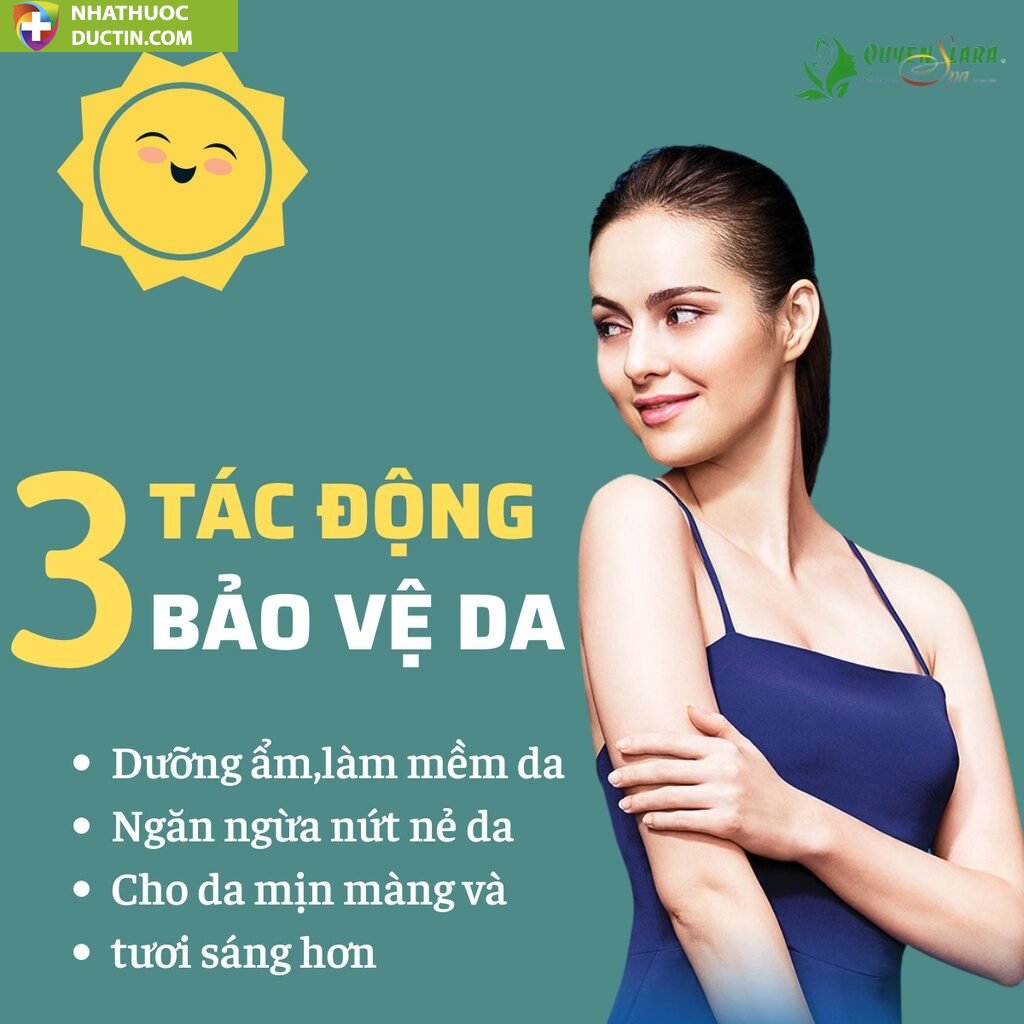 -Dưỡng trắng da,dưỡng ẩm toàn thân,góp phần ngăn ngừa quá trình lão hóa da sớm,làm mờ các vết thâm,sạm dam,giúp da tươi sáng về đều màu