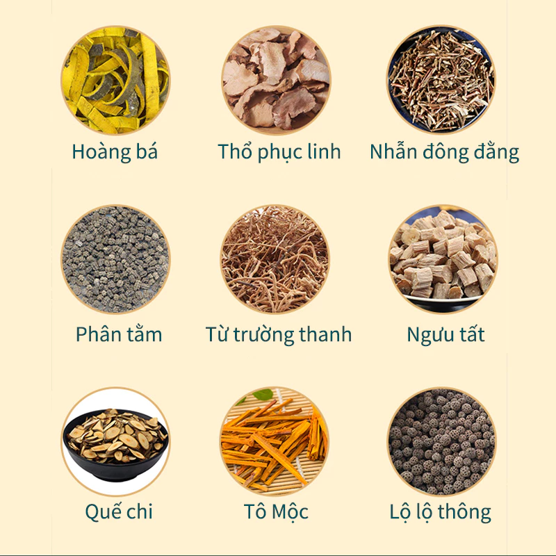 🌿Thành phần chủ yếu: Hoàng bá, Thổ phục linh, Nhẫn đông đằng, Phân tằm, Từ trường thanh, Ngưu tất, Quế chi, Tô Mộc, Lộ lộ thông