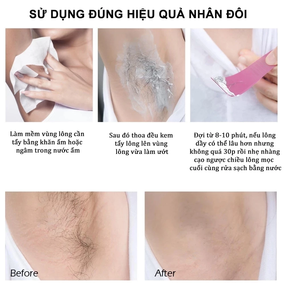 1.Dùng khăn nóng hoặc tắm nước nóng trước sau khi làm mềm sợi lông, sau đó thoa đều kem tẩy lông lên tay, nách và chân với một lượng có kích thước cỡ đồng xu, thời gian chờ phụ thuộc vào độ dày các sợi lông riêng lẻ (đề xuất đợi từ 3 đến 10 phút để có kết quả tốt nhất),