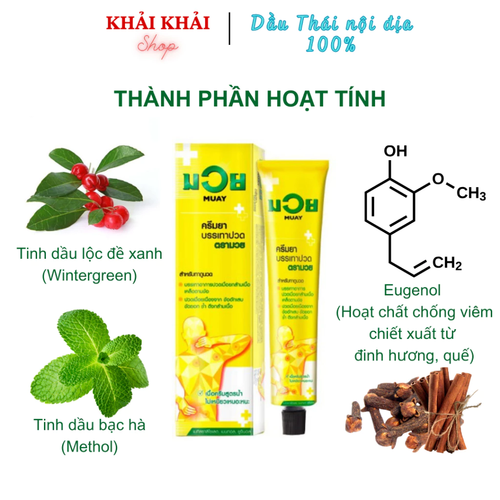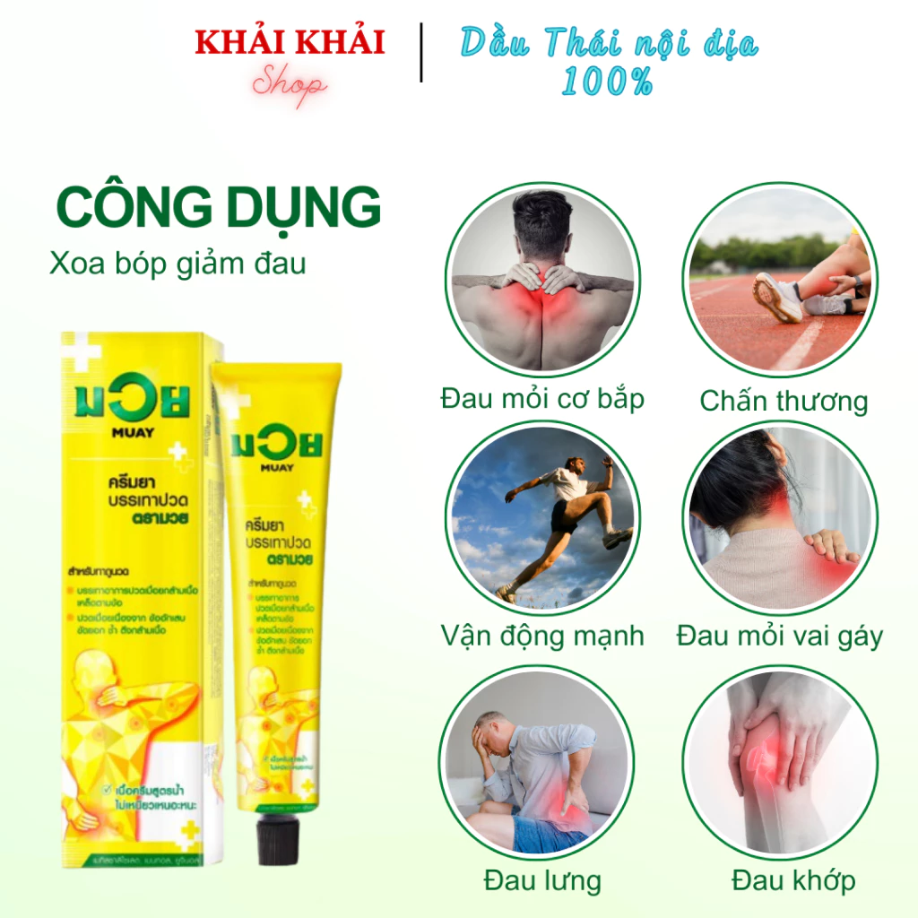– Dầu xoa bóp muay boxing Thái Lan chống viêm, giảm đau nhức các khớp bả vai, đốt sống cổ, lưng, khớp gối tay chân, đau đầu, đau mỏi vai gáy.
