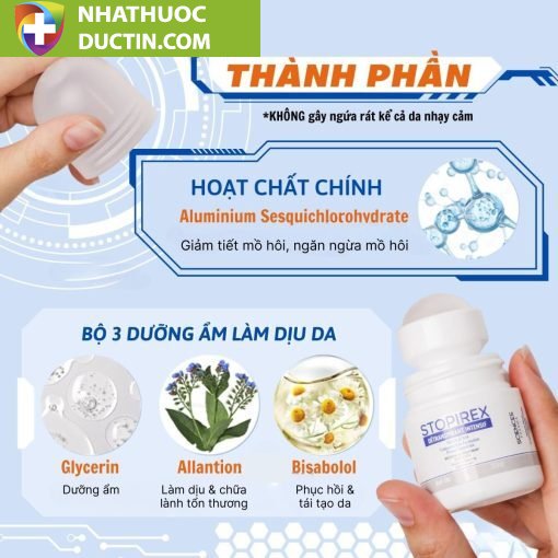 Lăn Khử Mùi Stopirex với công nghệ tiên tiến từ phòng thí nghiệm hàng đầu tại Pháp đặc biệt thành phần chính là Nhôm Aluminium hỗ trợ ngăn tiết mồ hôi và khử mùi cơ thể hiệu quả từ 5 – 7 ngày là giải pháp tối ưu cho các vấn đề về mùi cơ thể mang lại sự thoải mái, tự tin trong suốt cả ngày dài.