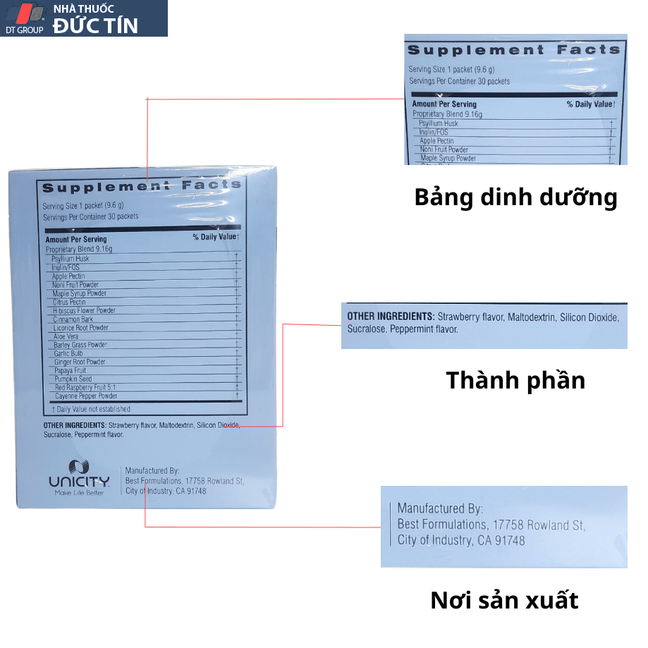 Bột vỏ hạt mã đề (52,0883%), Chất xơ Inulin/FOS (26,0417%), Pectin từ táo (4,1667%), Bột quả nhàu (3,125%), Bột siro mật phong (3,125%), Citrus Pectin (2,0833%), Bột hoa dâm bụt (2,0833%), Vỏ quế (0,7292%), Bột cam thảo (0,5208%), Hỗi hợp chất xơ thảo mộc (Lô hội, bột cỏ đại mạch, bột tỏi, bột củ gừng, quả đu đủ, hạt bí ngô, quả mâm xôi đỏ, bột ớt): (0,7302%).