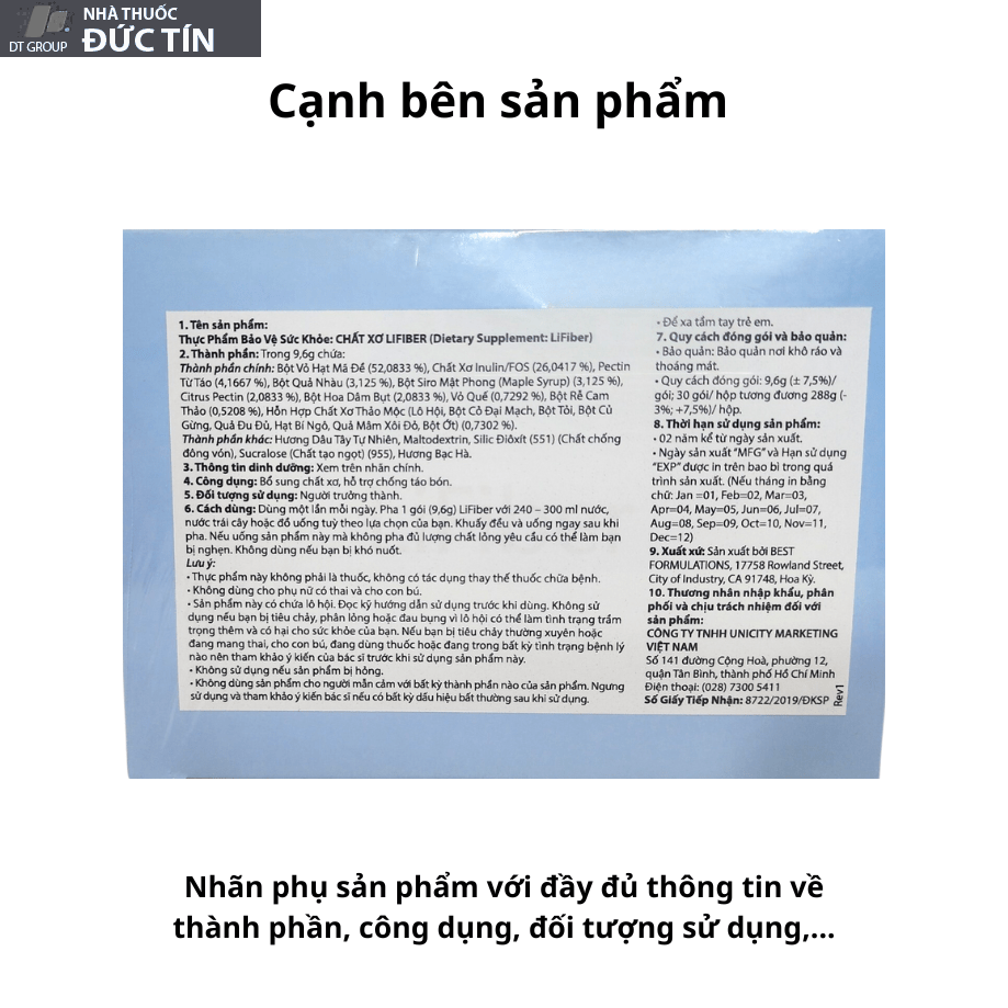 LiFiber là sản phẩm được sản xuất bởi Unicity, một công ty thực phẩm chức năng uy tín tại Hoa Kỳ. Sản phẩm được bào chế từ các thành phần tự nhiên, an toàn và lành tính.