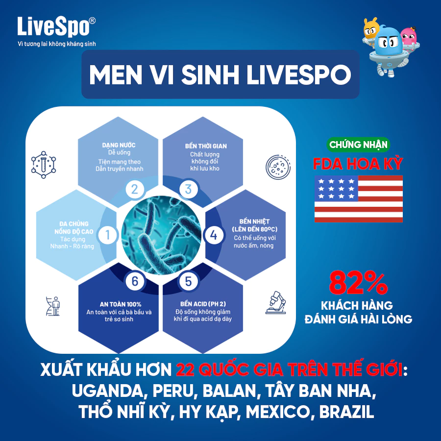 Công ty LiveSpo với sứ mệnh: “Vì một tương lai không kháng sinh”, là đơn vị tiên phong trong ngành khoa học về bào tử lợi khuẩn, đã mở ra một cuộc cách mạng mới trong lĩnh vực chăm sóc sức khỏe, giúp hiện thực hóa ước mơ xây dựng một cuộc sống khỏe mạnh không kháng sinh. Các sản phẩm của LiveSpo đã được kiểm nghiệm lâm sàng và có giấy chứng nhận bởi FDA Hoa Kỳ đưa sản phẩm bào tử lợi khuẩn có mặt tại 25 quốc gia trên toàn thế giới.