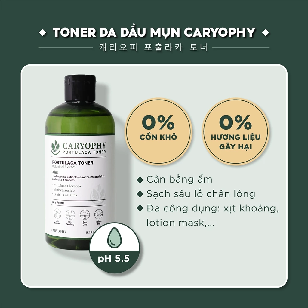Nước cân bằng Caryophy Portulaca Toner 300ml là nước hoa hồng Toner không cồn dành cho da dầu mụn đến từ Hàn Quốc, với các thành phần vô cùng lành tính, 100% từ thiên nhiên nên Toner Caryophy dùng được cho mọi loại da như da dầu, da mụn, da nhạy cảm, da hỗn hợp, da khô…