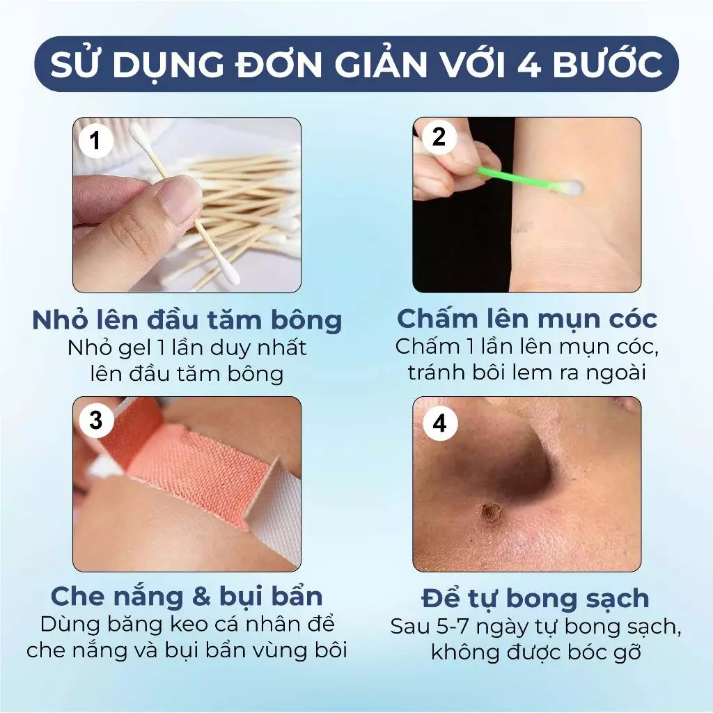 B2- Nghiêng lọ serum bôi mụn cóc, dùng tăm bông chấm lượng vừa đủ lên mụn. Lưu ý không chấm quá nhiều, để khô 3-5 phút là có thể đi lại hoạt động binh thường.