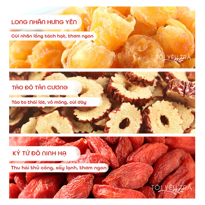 • Thành phần: Set trà dưỡng tâm an thần gồm 3 vị truyền thống (Long Nhãn, Táo Đỏ, Kỳ Tử).