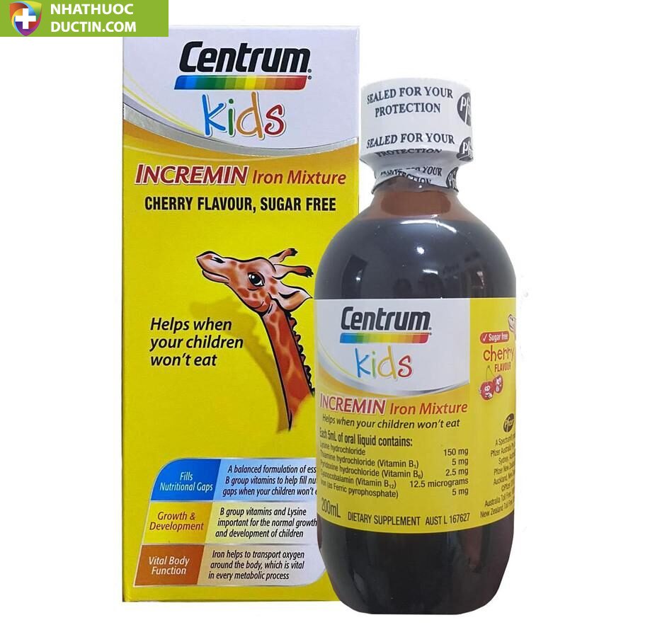 – Centrum Kids Incremin Iron Mixture ở dạng siro giúp bé dễ uống và hấp thụ nhanh hơn.
