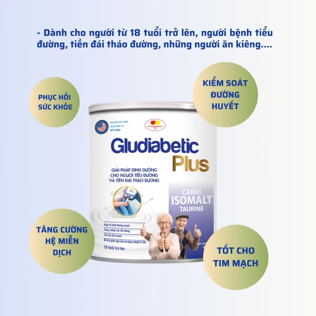 Sữa Bột Gludiabetic Plus với công thức tiên tiến và hệ dưỡng chất đặc chế giúp kiểm soát tốt đường huyết, hỗn hợp vitamin và khoáng chất dành cho người tiểu đường và những người béo phì, có nguy cơ mắc bệnh tiểu đường, tim mạch, giúp tăng cường sức khỏe, hỗ trợ tiêu hóa tốt, giúp giảm căng thẳng, mệt mỏi. Sữa Bột Gludiabetic Plus giúp thay thế bữa ăn phụ, bổ sung dinh dưỡng cho chế độ ăn kiêng của người bệnh tiểu đường giúp ổn định đường huyết, tốt cho hệ tim mạch, giúp ăn ngon, ngủ ngon.