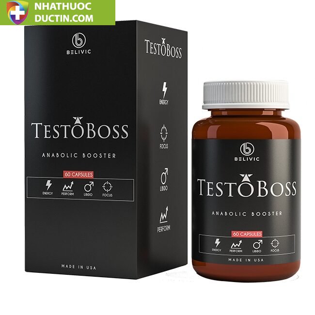 Testoboss hộp 60 viên là thực phẩm bảo vệ sức khỏe (TPBVSK) nhập khẩu từ Mỹ, giúp hỗ trợ tăng cường chức năng sinh lý nam, cải thiện ham muốn, hỗ trợ điều trị rối loạn cương dương, xuất tinh sớm, nâng cao chất lượng tinh trùng, bổ thận tráng dương, tăng cường testosterone nội sinh và sức khỏe toàn thân nhờ các thành phần thảo dược quý như Dâm dương hoắc, Bạch tật lê, Mật nhân, Maca, Kẽm, Ginkgo Biloba, và tinh hàu đại dương. Sản phẩm dạng viên nén, dùng 2 viên/ngày, nên sử dụng thường xuyên để đạt hiệu quả tốt nhất.