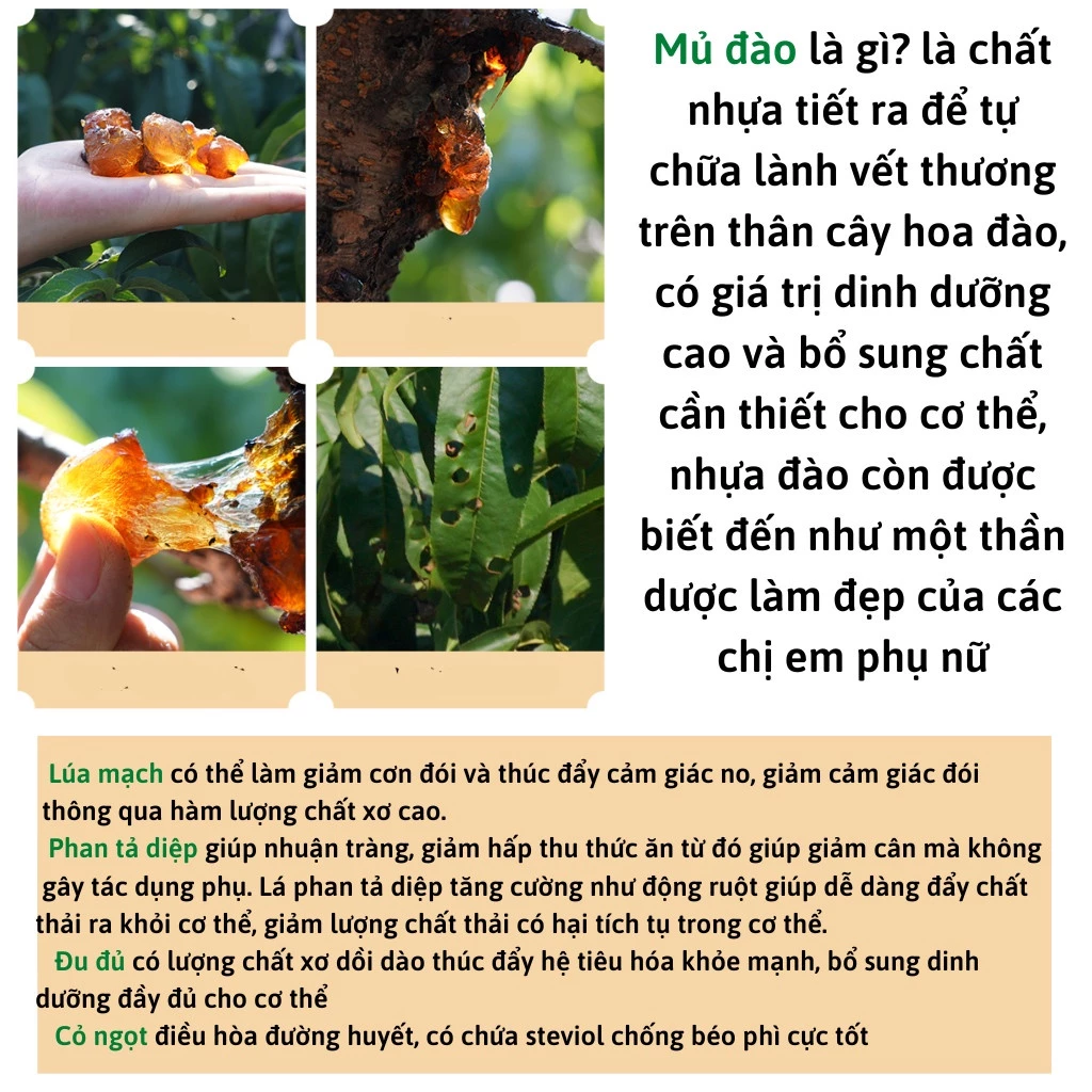 -Mủ đào(nhựa đào): giảm mỡ máu, điều tiết quá trình chuyển mỡ trong cơ thể , loại bỏ lượng mỡ dư thừa vùng bụng, cánh tay một cách an toàn bằng cách dùng đều đặn mỗi ngày