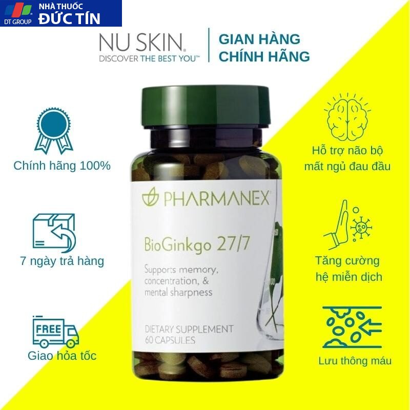 Thực Phẩm Bảo Vệ Sức Khỏe Nuskin BioGinkgo 27/7 Tăng Cường Trí Nhớ Cho Não Sự khác biệt độc quyền chứa trong Bioginkgo khác với các sản phẩm khác Đây là sản phẩm an toàn. Được sử dụng trên toàn thế giới với chiết suất từ thiên nhiên Thành phần chính là lá bạch quả. Thảo dược quý hiếm lưu truyền từ xa xưa có lợi cho trí não Chuẩn hóa theo tỷ lệ khoa học của 27% ginkgo flavone glycoside và 7% terpene lactones theo tiêu chuẩn của Đức. Đã được chứng minh lâm sàng giúp tăng sức khỏe trí não.