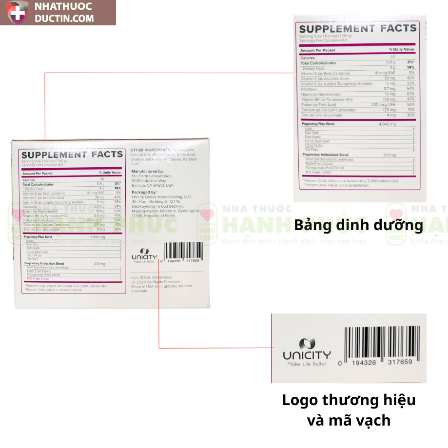 Inulin (19,914 %), Gôm Guar (15,723 %), Gôm Arabic (8,176 %), Gôm Đậu Locust (7,635 %), Citrus Pectin (6,289 %), Canxi Carbonate (4,830 %), Chất Xơ Yến Mạch (4,403 %), Nấm Men Epicor (3,145 %), Chiết Xuất Táo (0,956 %), Axit Ascorbic (0,604 %), Kẽm Gluconate (0,454 %), Chiết Xuất Quả Lựu (0,414 %), Beta Carotene (0,226 %), Chiết Xuất Nho Đỏ (0,177 %), Niacinamide (0,164 %), D Alpha Tocopheryl Acetate (0,153 %), Axit Folic (0,025 %), Pyridoxine HCl (0,019 %), Thiamine HCl (0,019 %), Riboflavin (0,019 %).
