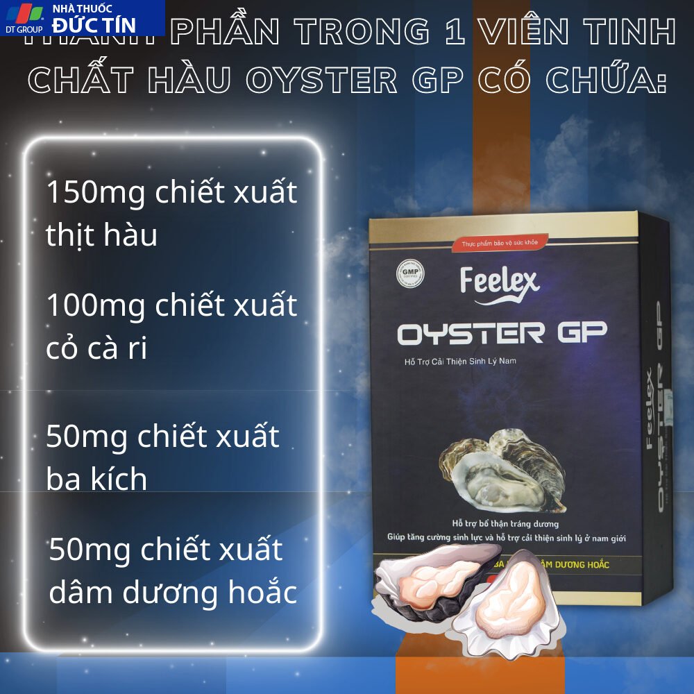Tinh chất hàu biển cao cấp oyster GP Feelex chứa các dưỡng chất thiết yếu như: Kẽm, các vitamin, khoáng chất và acid amin từ Hàu biển trong lành nhất thế giới; giúp hỗ trợ tăng cường sức khỏe và