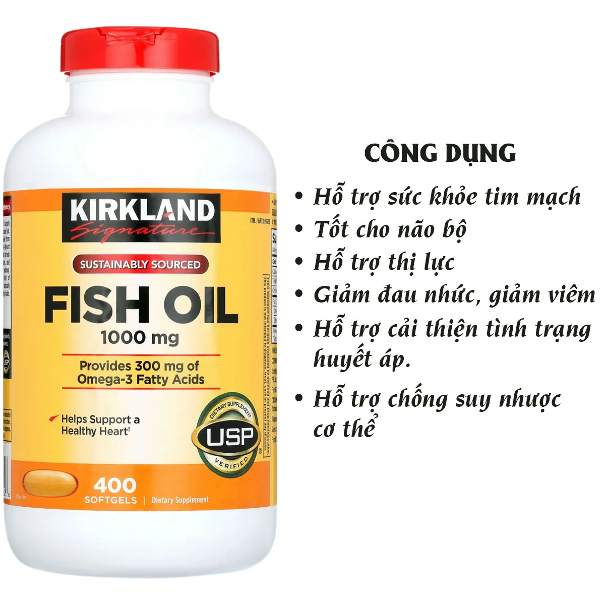 – Dầu cá Omega-3 Kirkland Signature giúp hỗ trợ sức khỏe tim mạch của bạn. Nguồn cung cấp Dầu cá đến từ cá nước sâu trong đại dương, không phải cá nuôi trong trang trại. Các quy trình thanh lọc tiên tiến nhất được sử dụng để loại bỏ thủy ngân.