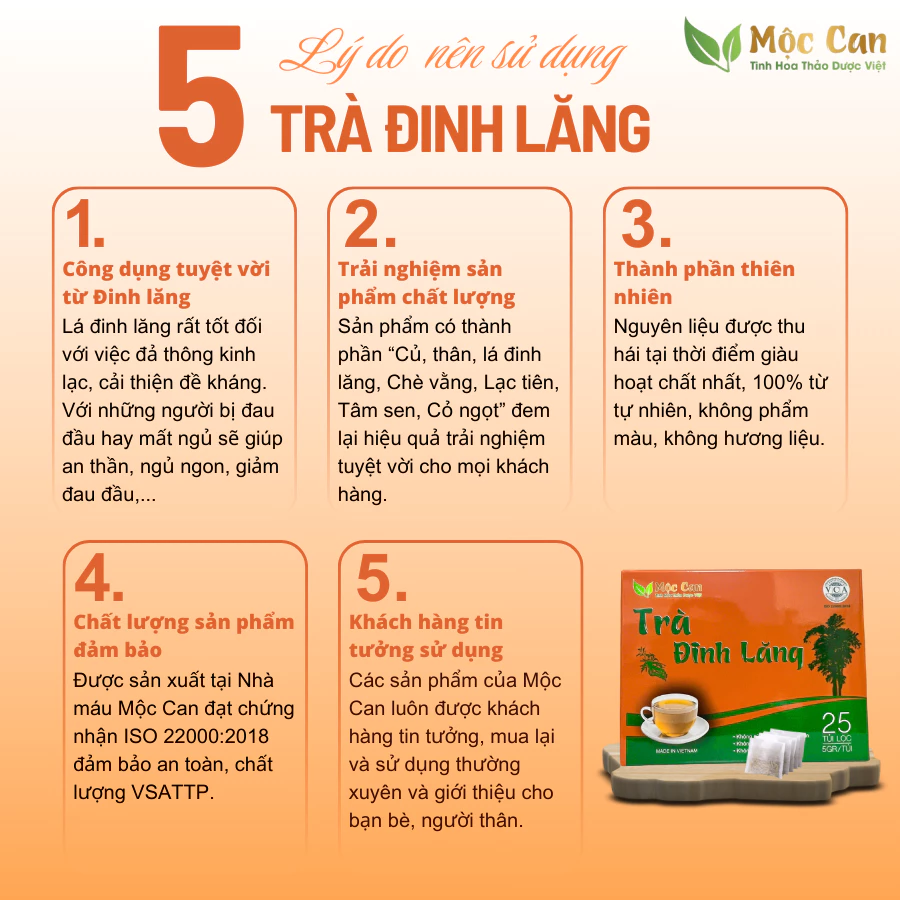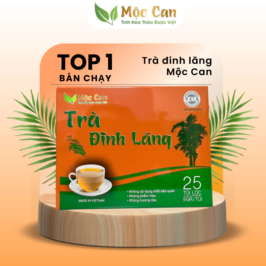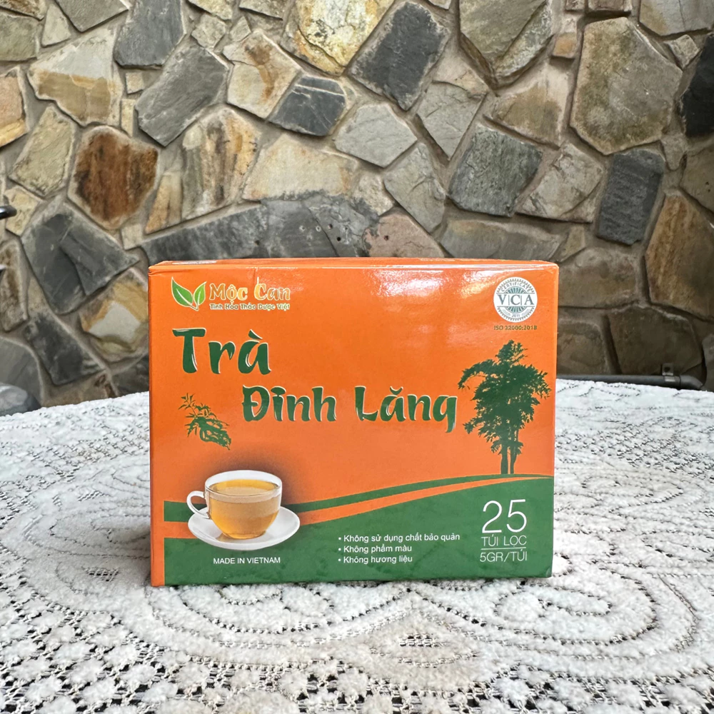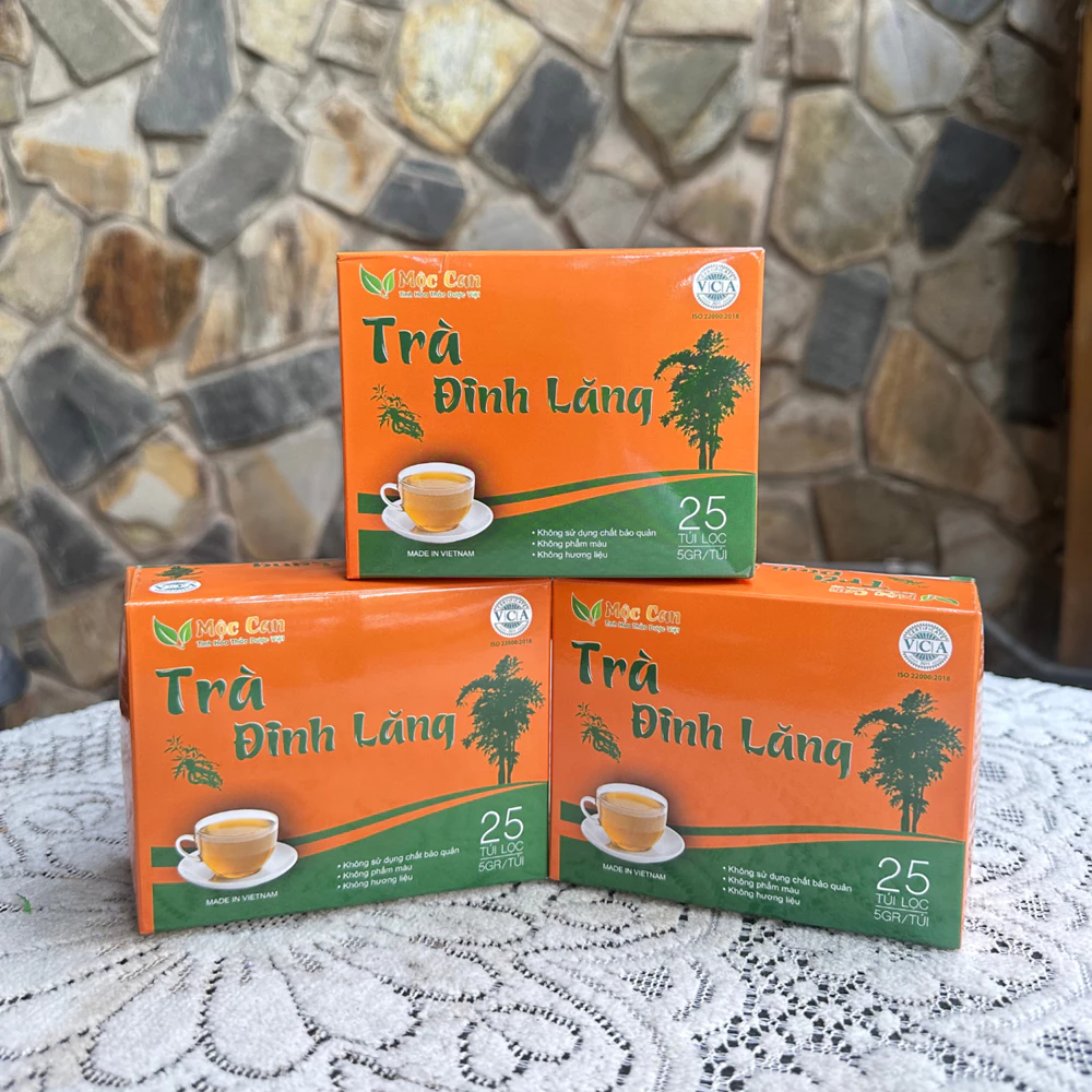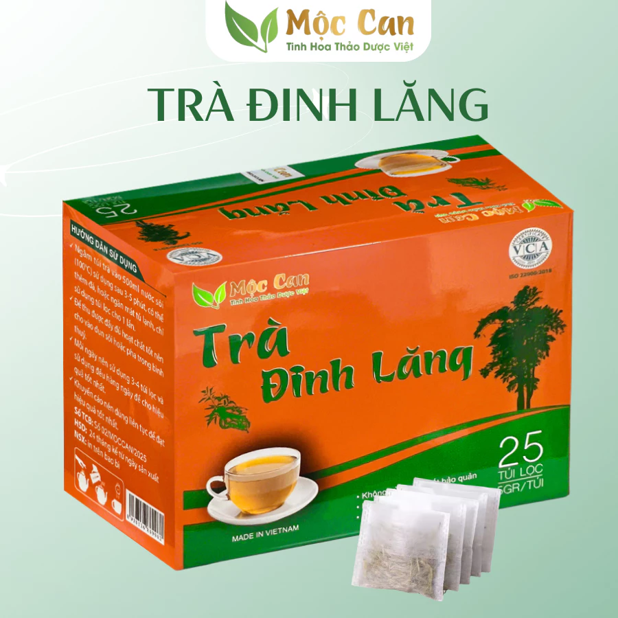 – Trà Đinh Lăng Mộc Can được đóng túi giấy có trọng lượng 125g, bên trong có 25 túi lọc nhỏ, mỗi túi 5g.
