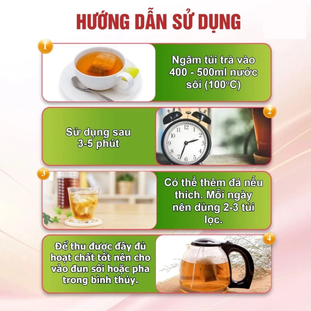 -Hoà 1 gói lọc với cốc 200ml nước sôi . Chờ 5 phút cho dược liệu ngấm ra cốc rồi trực tiếp sử dụng. 1 gói trà có thể sử dụng được 2 lần nước. Để có hiệu quả tốt nhất ngày dùng từ 2-3 gói lọc, dùng liên tục trong vòng 6 tháng