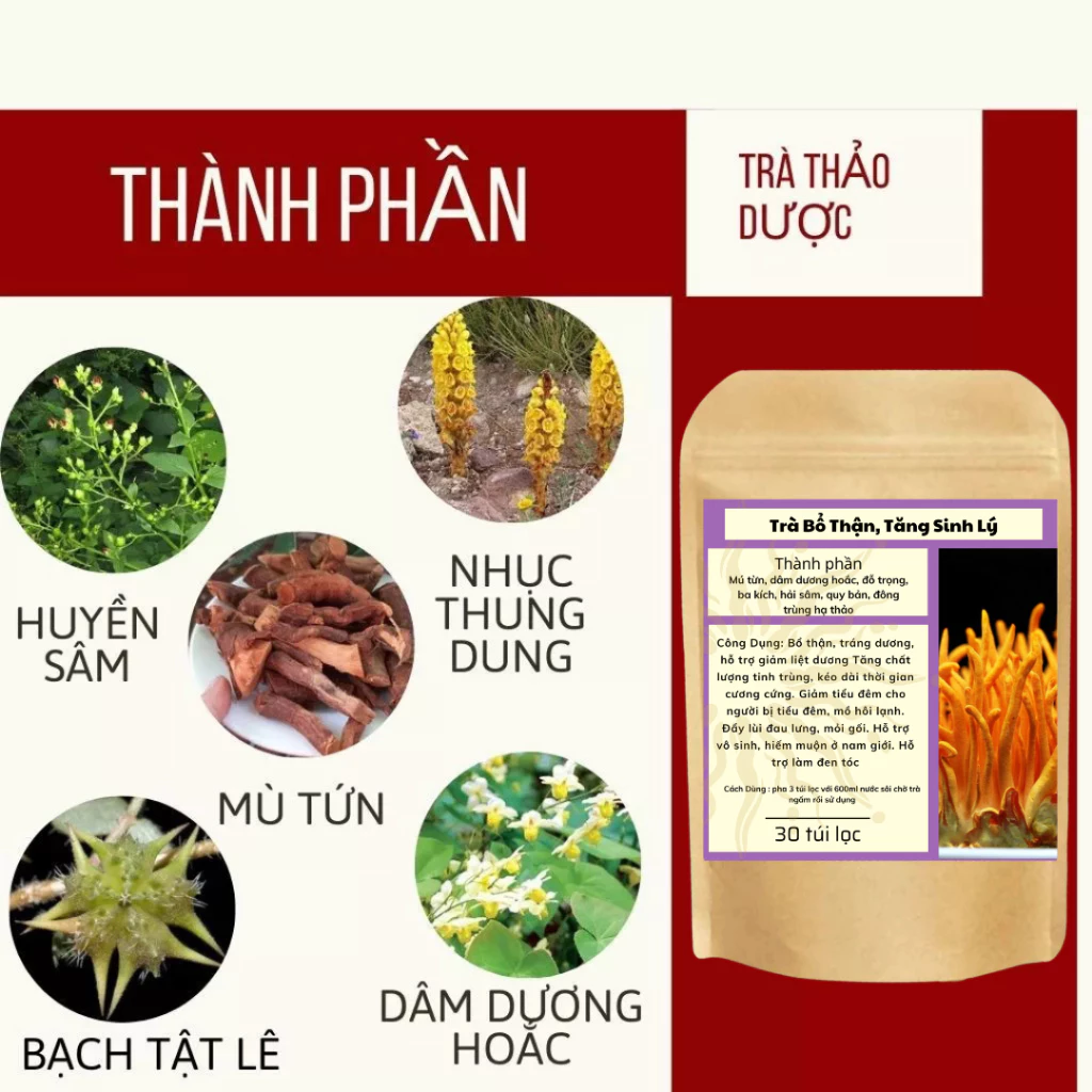 Trà bổ thận dương tăng cường sinh lý dứt điểm tình trạng xuất tinh sớm rối loạn cương dương được kết hợp từ 7 vị thảo dược quý theo phương pháp Y Học Cổ Truyền , 7 loại dược liệu này nằm trong nằm trong danh mục 135 cây dược liệu có tính năng hỗ trợ bệnh được Bộ Y Tế cấp phép vì vậy được đánh giá cao về mức độ an toàn, lành tính.