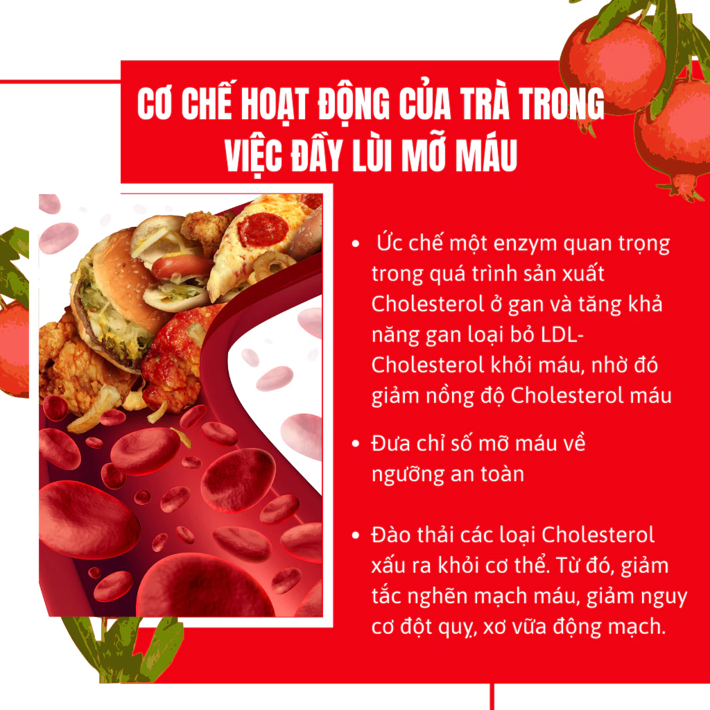 – Giảm mỡ máu: Trà giúp giảm chỉ số cholesterol xấu và triglyceride trong máu, đưa chỉ số mỡ máu về ngưỡng an toàn.