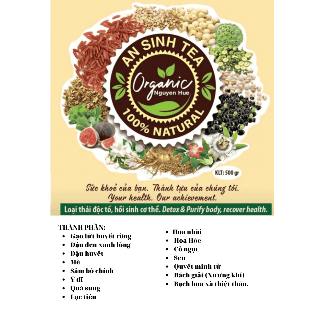 • Thành phần: TRÀ AN SINH ORGANIC là sự kết hợp của các vị thuốc dân gian như gạo lứt huyết rồng, đậu đen xanh lòng, mè, ý dĩ, quả sung, hạt sen, tim sen, lá sen, quyết minh tử, lạc tiên, hoa nhài, hoa hòe, cỏ ngọt, bách giải, SÂM bố chính, bạch hoa xà thiệt thảo, …