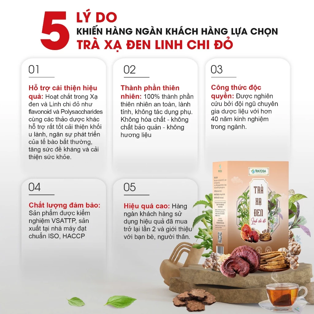 Sự kết hợp hoàn hảo giữa Xạ Đen và Linh Chi Đỏ cùng các thành phần thảo dược khác tạo nên công thức trà giúp hỗ trợ tiêu u lành và thải độc gan, hỗ trợ tim mạch. Đồng thời, còn nâng cao hệ miễn dịch và phòng ngừa nguy cơ hình thành tế bào bất thường mang lại giải pháp chăm sóc sức khỏe một cách an toàn và hiệu quả.