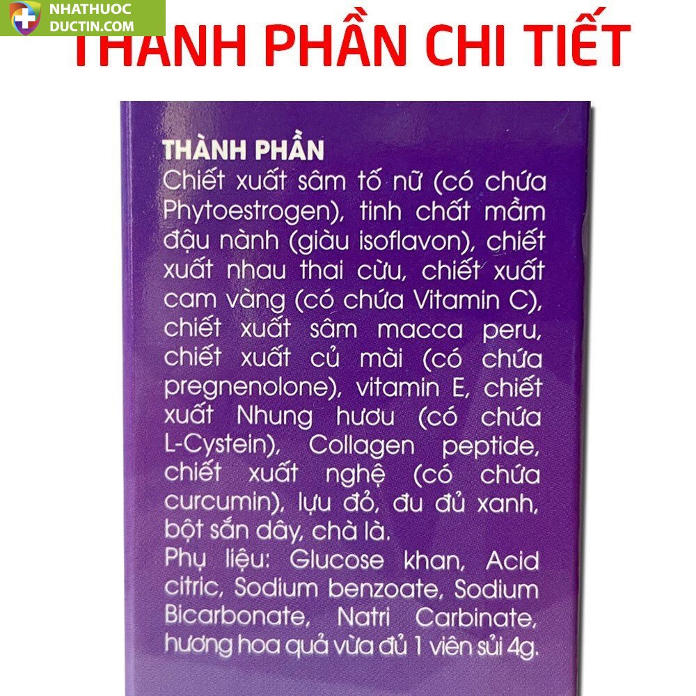 – Sâm macca peru, nhung hươu (có chứa l-cystine), sữa ong chúa, chiết xuất đu đủ xanh, bột mầm đậu nành, sâm tố nữ, chiết xuất bưởi đỏ, cam mỹ, quả bơ, vitamin e, vitamin C, phụ liệu vừa đủ 1 viên sủi 4g.