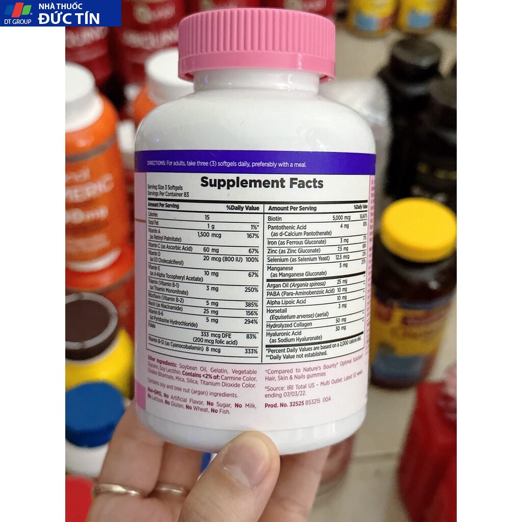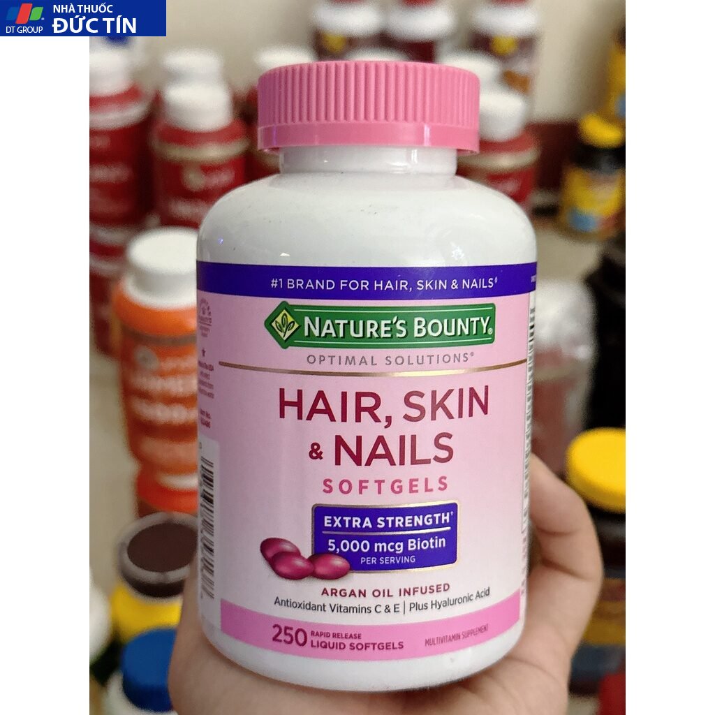 – Nature’s Bounty Hair, Skin, Nail có chứa 5000 mcg Biotin, Vitamin C, Vitamin E, Collagen, Alpha Lipoic Acid & Calcium… và 24 dưỡng chất giúp chăm sóc da, tóc, móng một cách hiệu quả