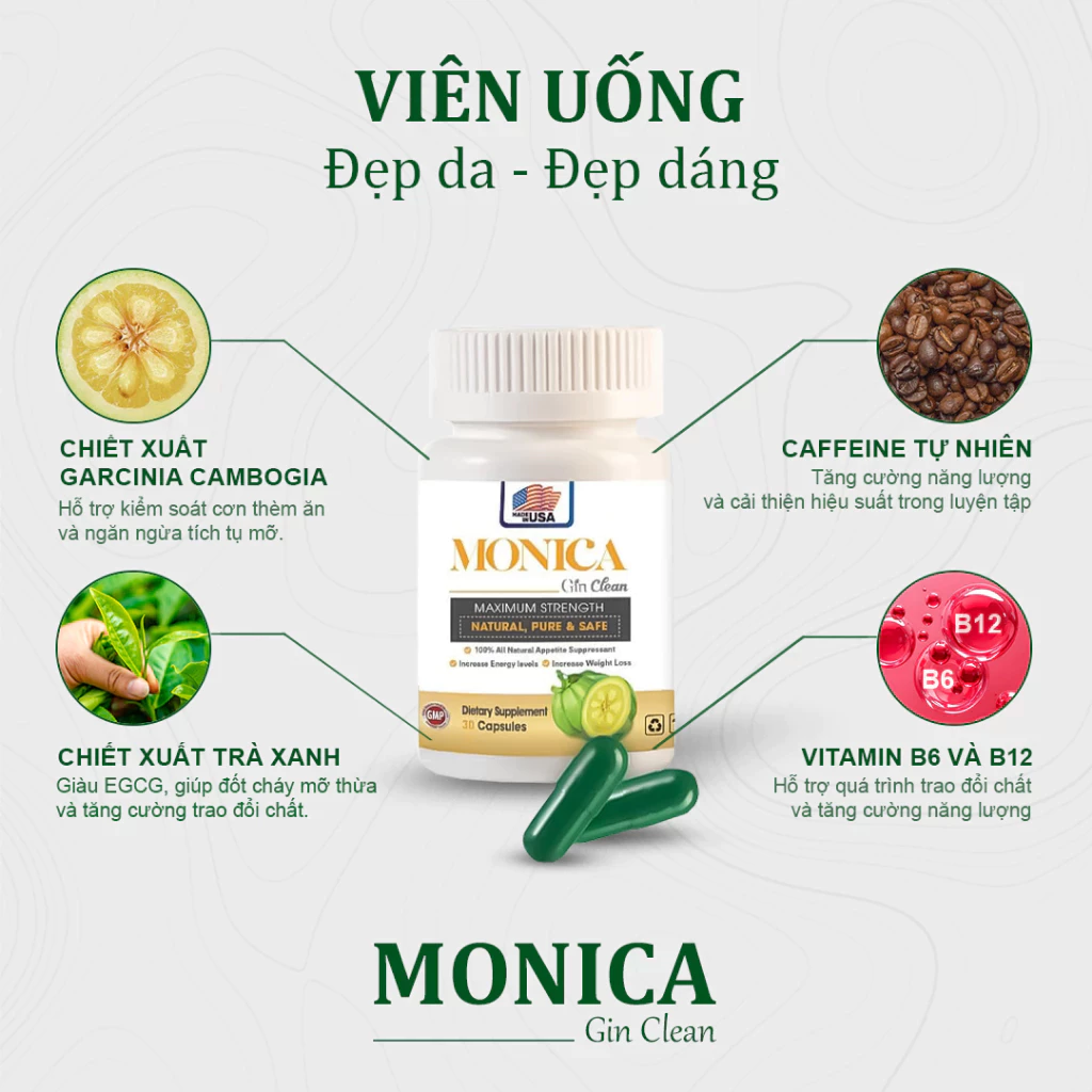 Thành Phần đốt mỡ siết cơ MONICA: viên uống giảm cân, thuốc giảm cân, ginclean, monica. thuốc giảm cân cấp tốc. detox giảm cân.
