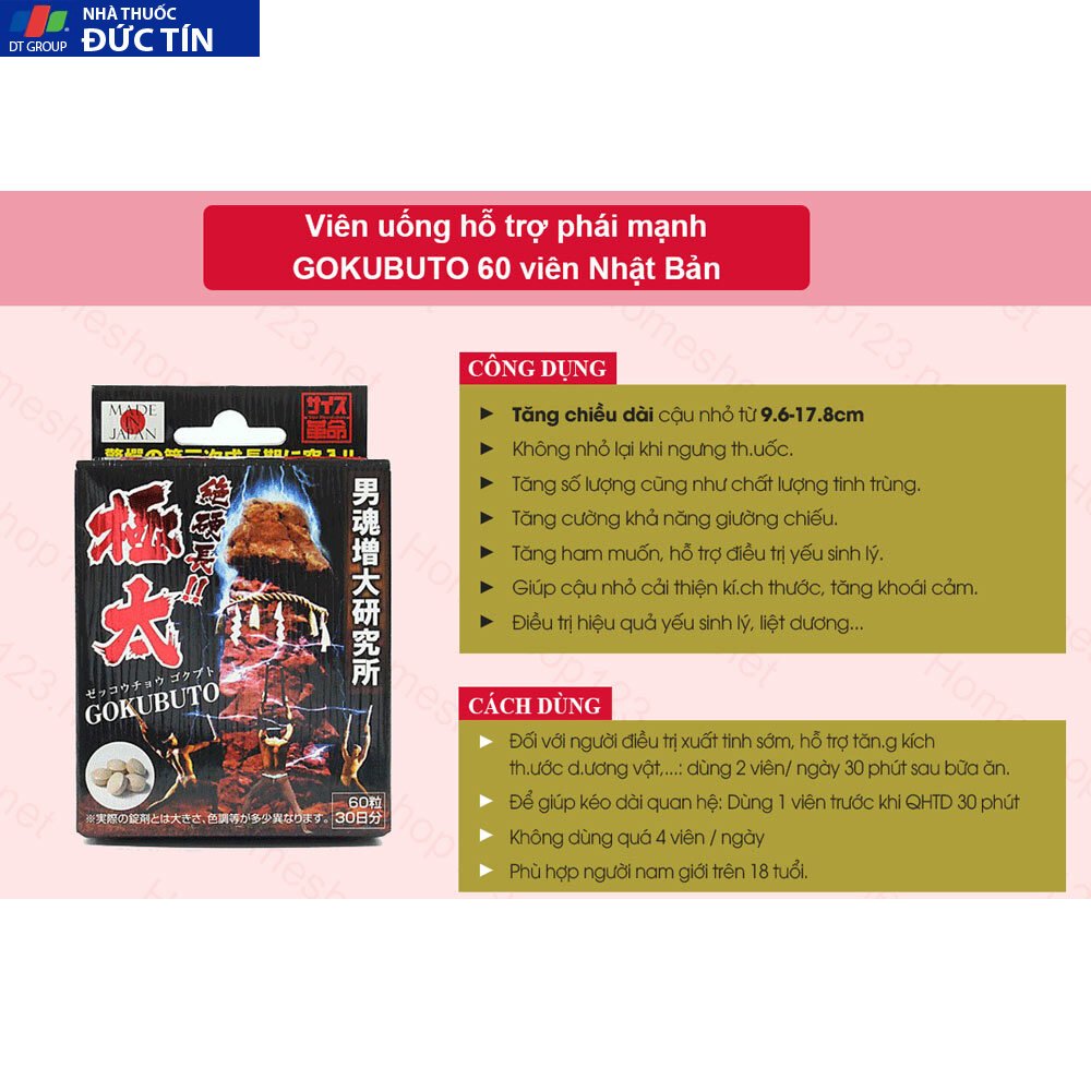 - Những chuyên gia hàng đầu tại Nhật Bản đã nghiên cứu và bào chế thành công viên uống cải thiện sinh lý và kích thước cho nam giới Gokubuto. Với thành phần từ các nguyên liệu bổ dưỡng hàng đầu cho phái mạnh.