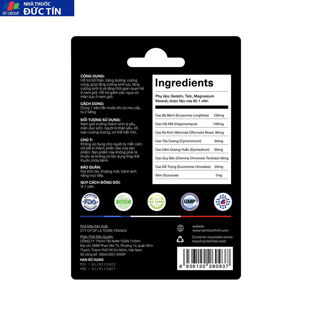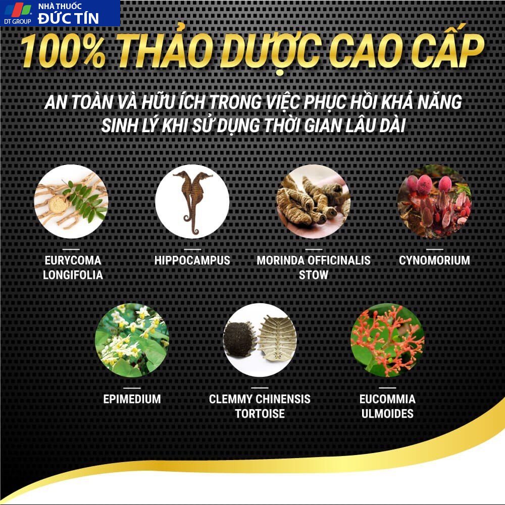 - Đặc điểm: Hỗ trợ bổ thận, tráng dương, tăng cường khả năng cương cứng và kéo dài thời gian quan hệ cho các quý ông gấp 3 – 5 lần. Đồng thời hồi phục sức khỏe cho phái mạnh sau khi quan hệ, giúp phòng ngừa nguy cơ mãn dục ở người nam.