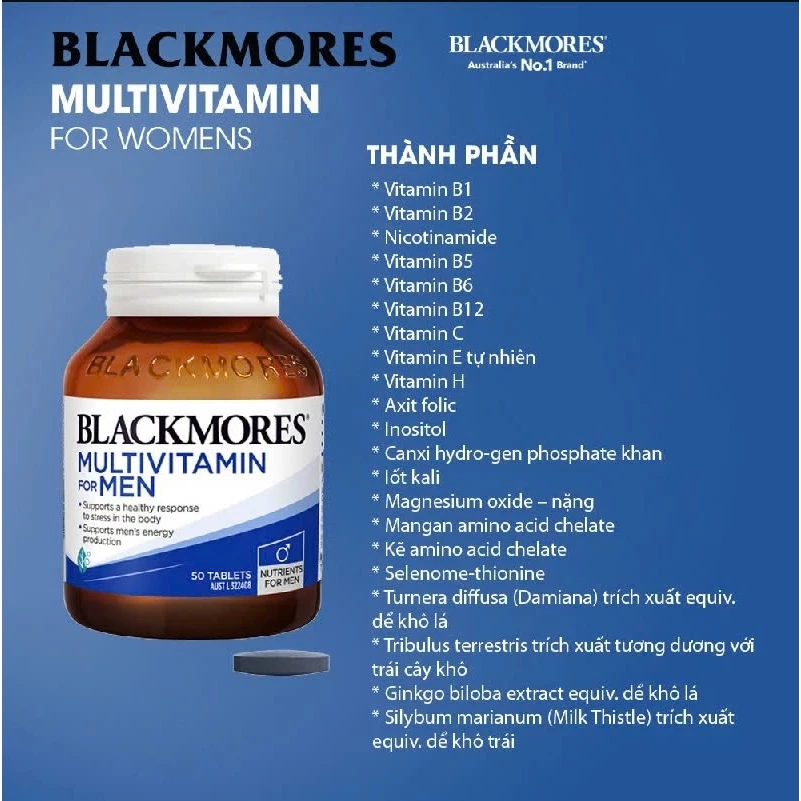 Blackmores Multivitamin for Men là sản phẩm bổ sung vitamin tổng hợp và khoáng chất có chứa chiết xuất từ thảo dược giúp hỗ trợ sản xuất năng lượng cho nam giới. Nó chứa các thành phần giúp hỗ trợ sức khỏe nói chung, sản xuất năng lượng, hiệu suất tập thể dục và chức năng tâm thần khi chế độ ăn uống không đầy đủ. Nó cũng chứa các thành phần hỗ trợ chức năng tình dục lành mạnh.