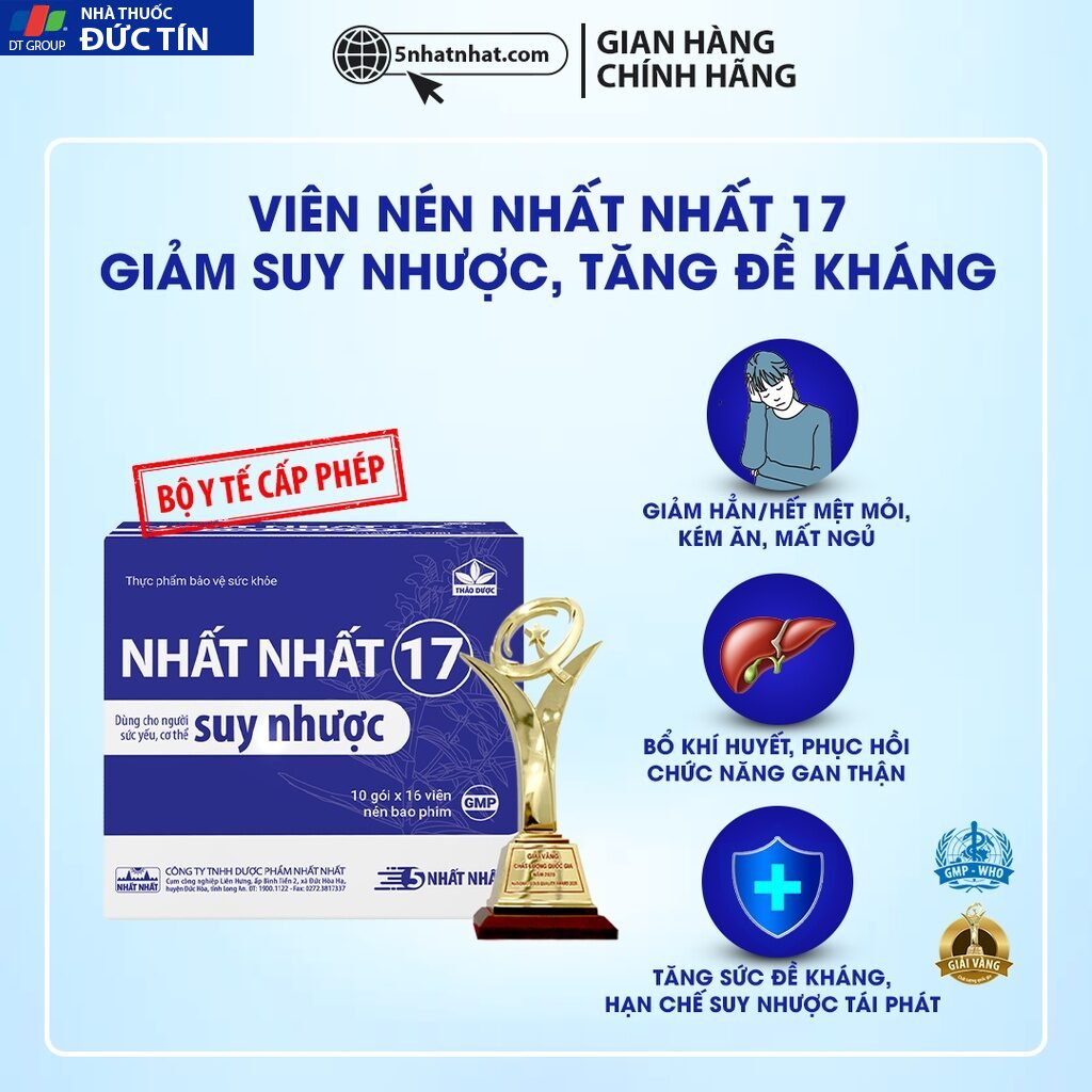 Sử dụng viên nén Nhất Nhất 17 với tiêu chuẩn GMP-WHO khắt khe theo khuyến cáo của Tổ chức y tế thế giới, sản xuất tại nhà máy Dược phẩm Nhất Nhất – Giải vàng chất lượng quốc gia do Thủ tướng chính phủ trao tặng chính là lựa chọn ưu việt dành cho bạn. Nhất Nhất 17 là giải pháp giúp bồi bổ, phục hồi chức năng của cơ thể, tăng cường sức đề kháng nhằm giải tỏa căng thẳng, mệt mỏi, đẩy lùi suy nhược và các vấn đề sức khỏe liên quan.